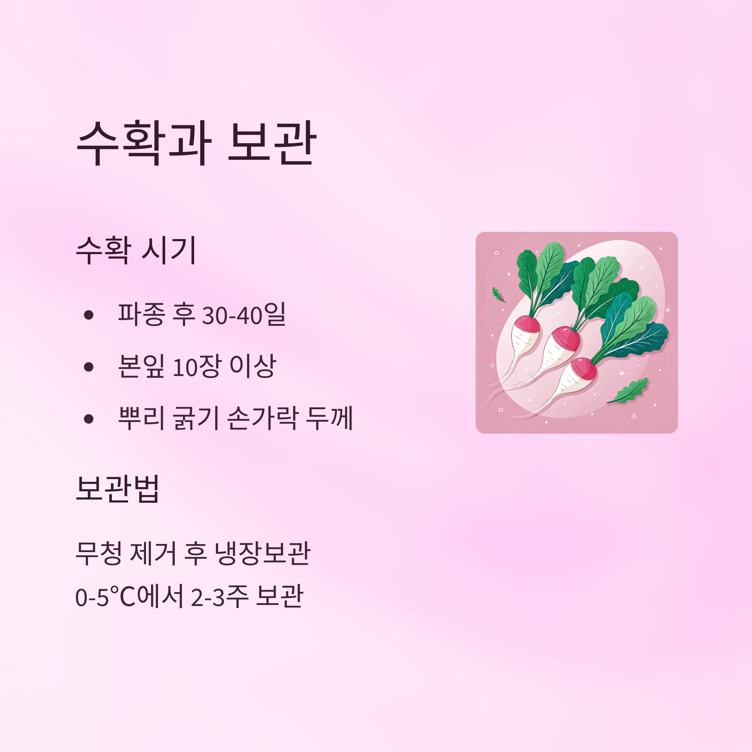 알타리무는 관리만 잘하면 풍성한 수확이 가능해요. 다음 에서는 수확 시기와 보관법을 자세히 알려드릴게요. 아삭하고 싱싱한 무를 오래 보관하는 팁도 함께 공유할게요! 🧺