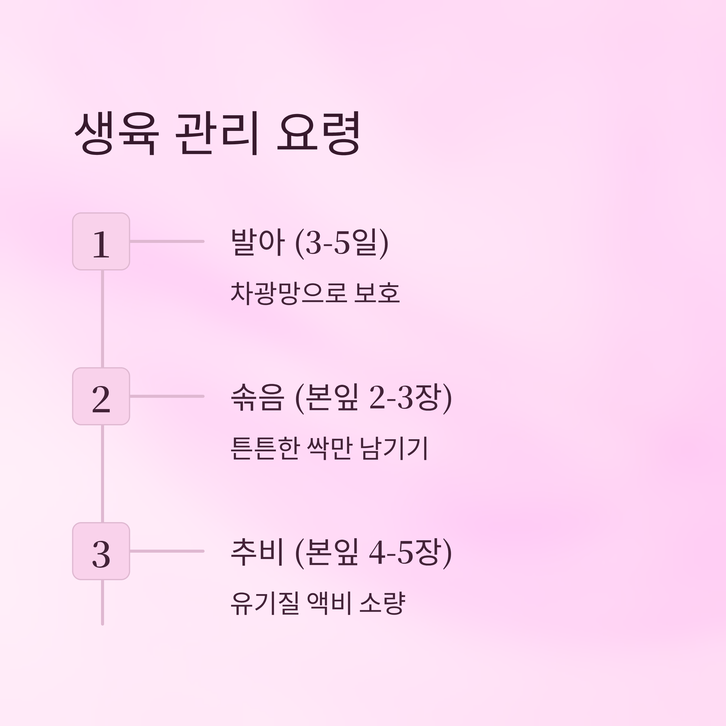 파종 후엔 가볍게 물을 뿌려 흙을 촉촉하게 유지해요. 너무 많은 물은 씨앗을 떠내려 보내거나 썩게 할 수 있어서 분무기로 뿌리는 방식이 좋아요. 발아까지는 보통 3~5일이 걸려요. 이때 직사광선에 너무 오래 노출되면 싹이 타들어갈 수 있으니 살짝 차광망을 덮는 것도 한 방법이에요.