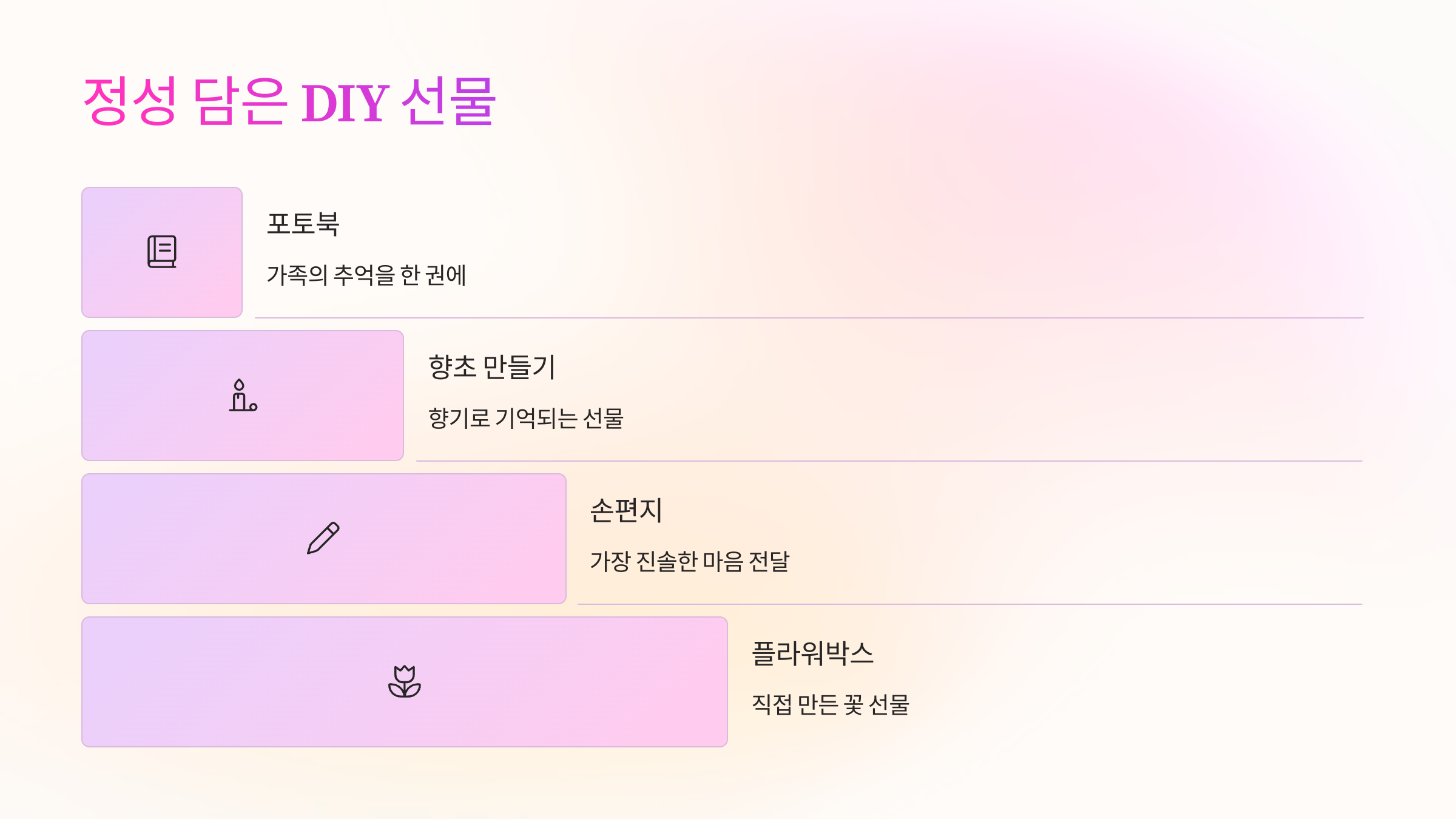 가끔은 직접 만든 선물이 부모님께 가장 큰 감동을 줄 때가 있어요. 진심을 담아 만든 것에는 가격으로 환산할 수 없는 특별함이 있거든요. 부모님도 자식이 직접 준비한 선물에 가장 큰 감동을 느끼신다는 거, 알고 계셨나요? 🥹