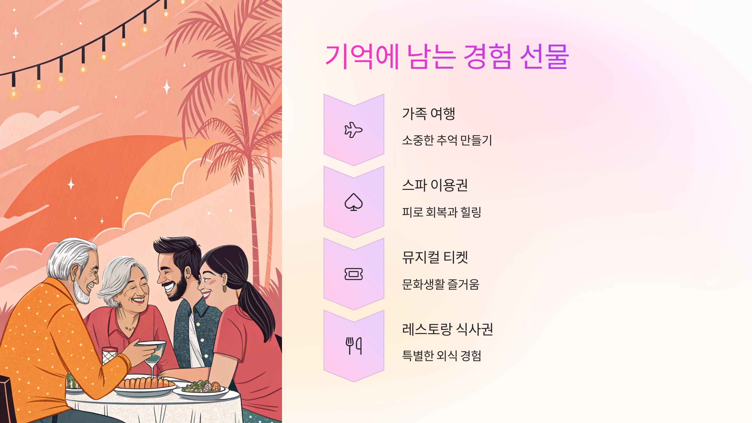 대표적인 경험 선물로는 가족 여행, 레스토랑 식사권, 연극/뮤지컬 티켓, 스파/마사지 이용권이 있어요. 부모님을 모시고 하루 특별한 나들이를 가는 것도 정말 멋진 선물이 되죠!