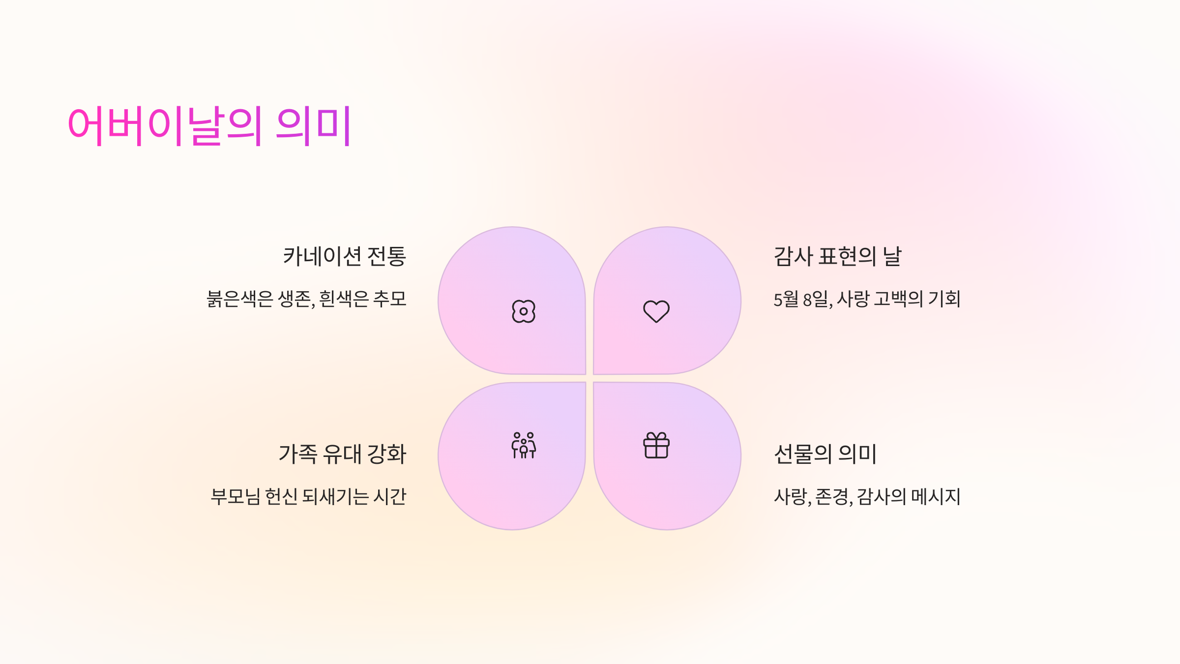 어버이날은 부모님께 감사의 마음을 전하는 특별한 날이에요. 매년 5월 8일, 부모님께 평소 하지 못했던 사랑 고백을 선물과 함께 표현할 수 있는 기회가 주어지죠. 이 날을 통해 우리는 부모님의 헌신과 사랑을 되새기고, 가족 간의 유대를 다시 한 번 확인하게 돼요.