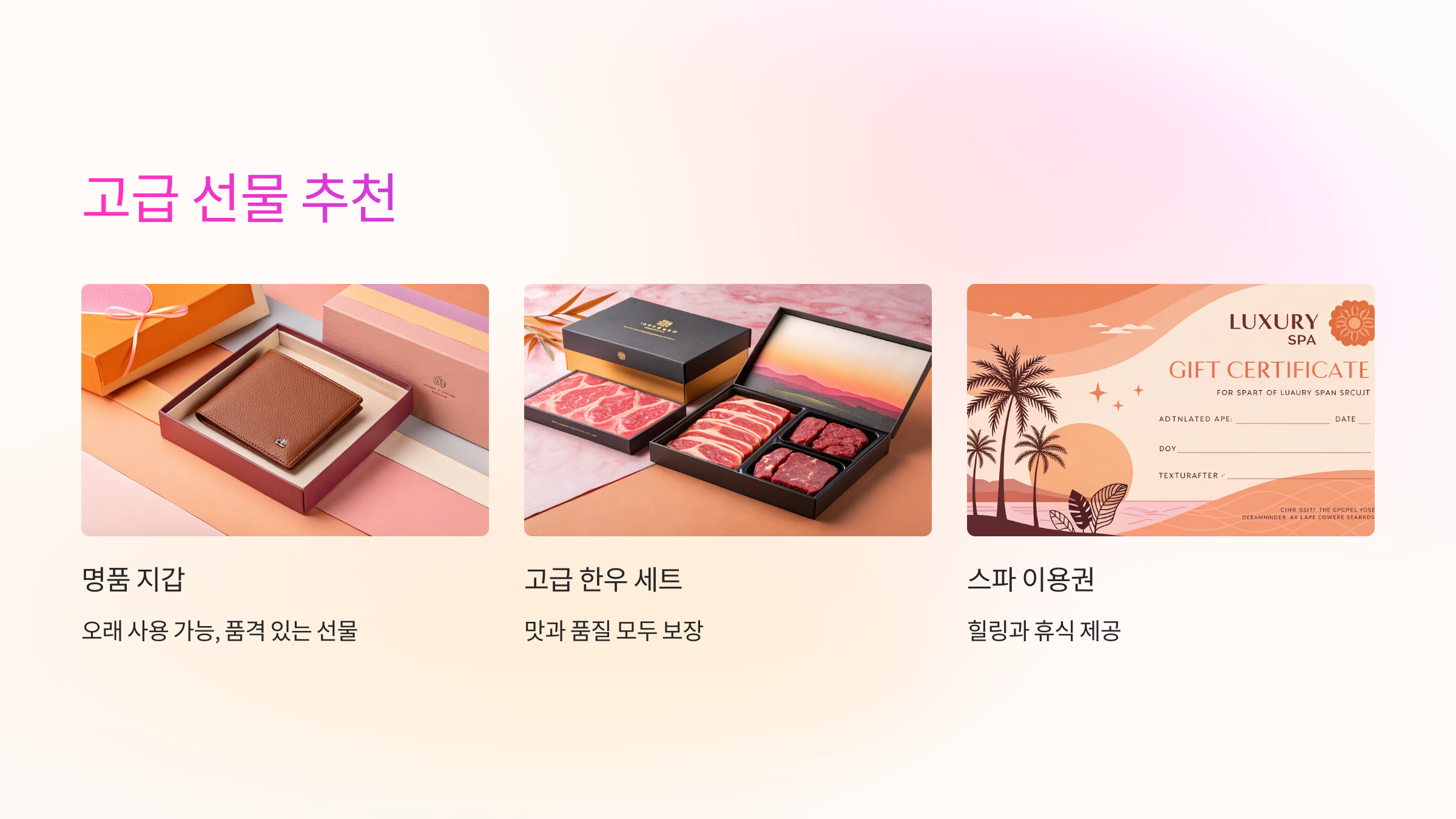 | 명품 지갑 | 오래 사용 가능, 품격 있는 선물 |