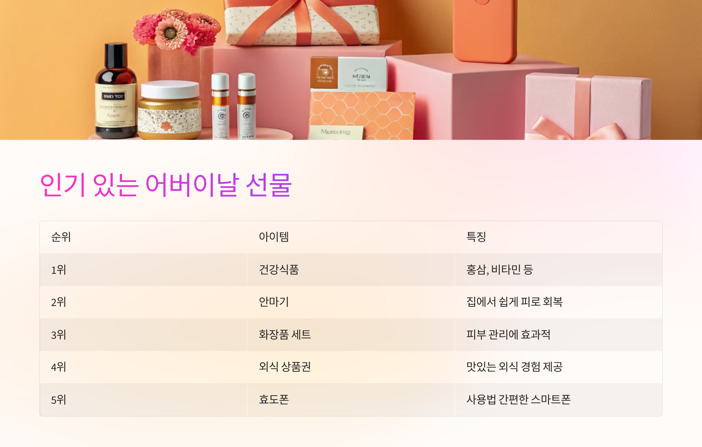 대표적으로 건강식품, 마사지기, 화장품 세트, 외식 상품권, 효도폰(스마트폰) 같은 것들이 꾸준히 인기예요. 특히 최근 몇 년간 건강에 대한 관심이 높아지면서 건강식품 선물은 거의 필수처럼 여겨지고 있어요.