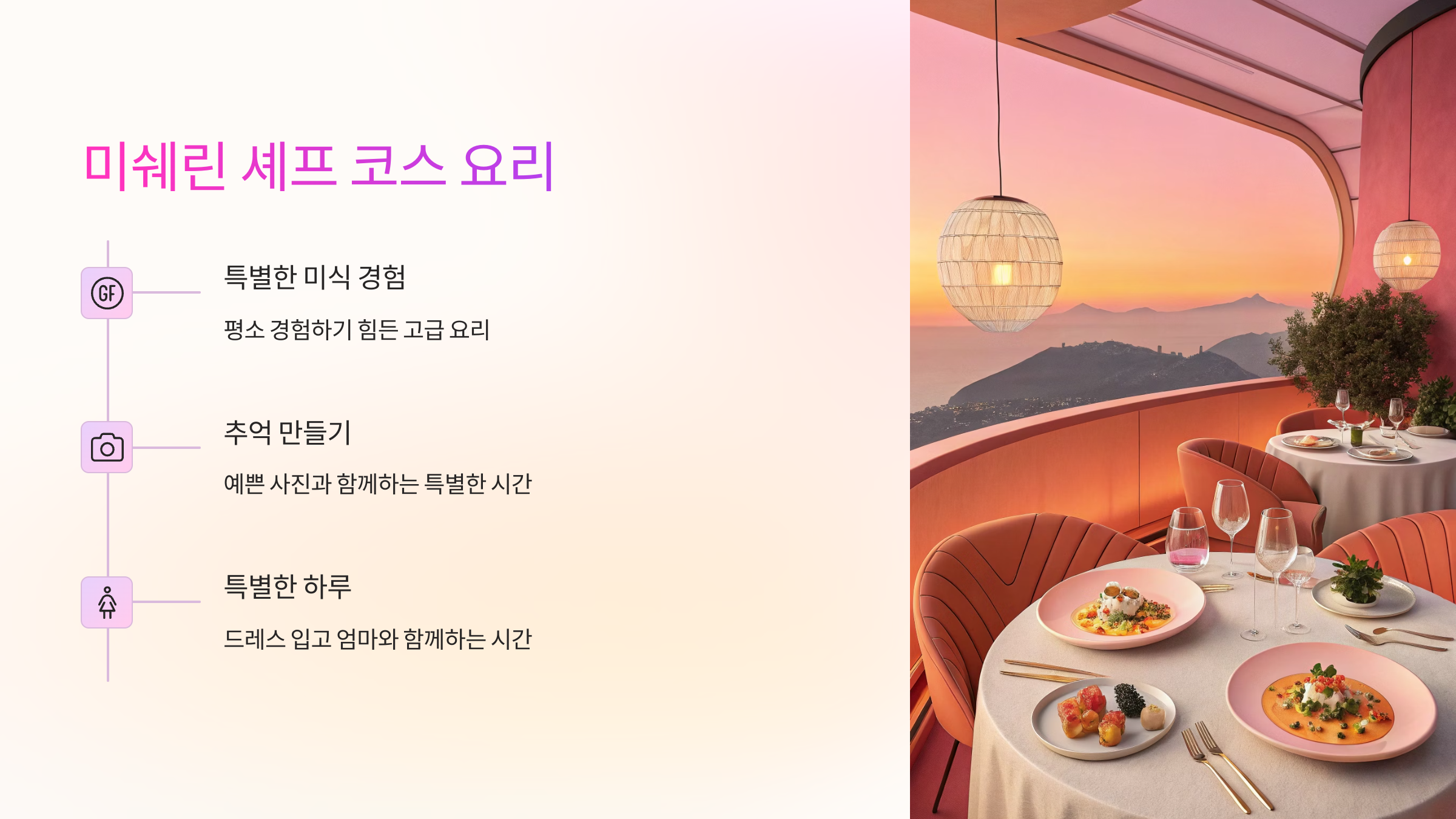 코스 요리는 분위기도 좋고, 사진도 예쁘게 남길 수 있어요. 특별한 드레스를 입고 엄마와 함께 멋진 하루를 보내는 것도 정말 소중한 기억이 될 거예요. 예약할 때는 알러지 여부나 식성도 미리 체크하는 센스, 잊지 마세요! 🍷