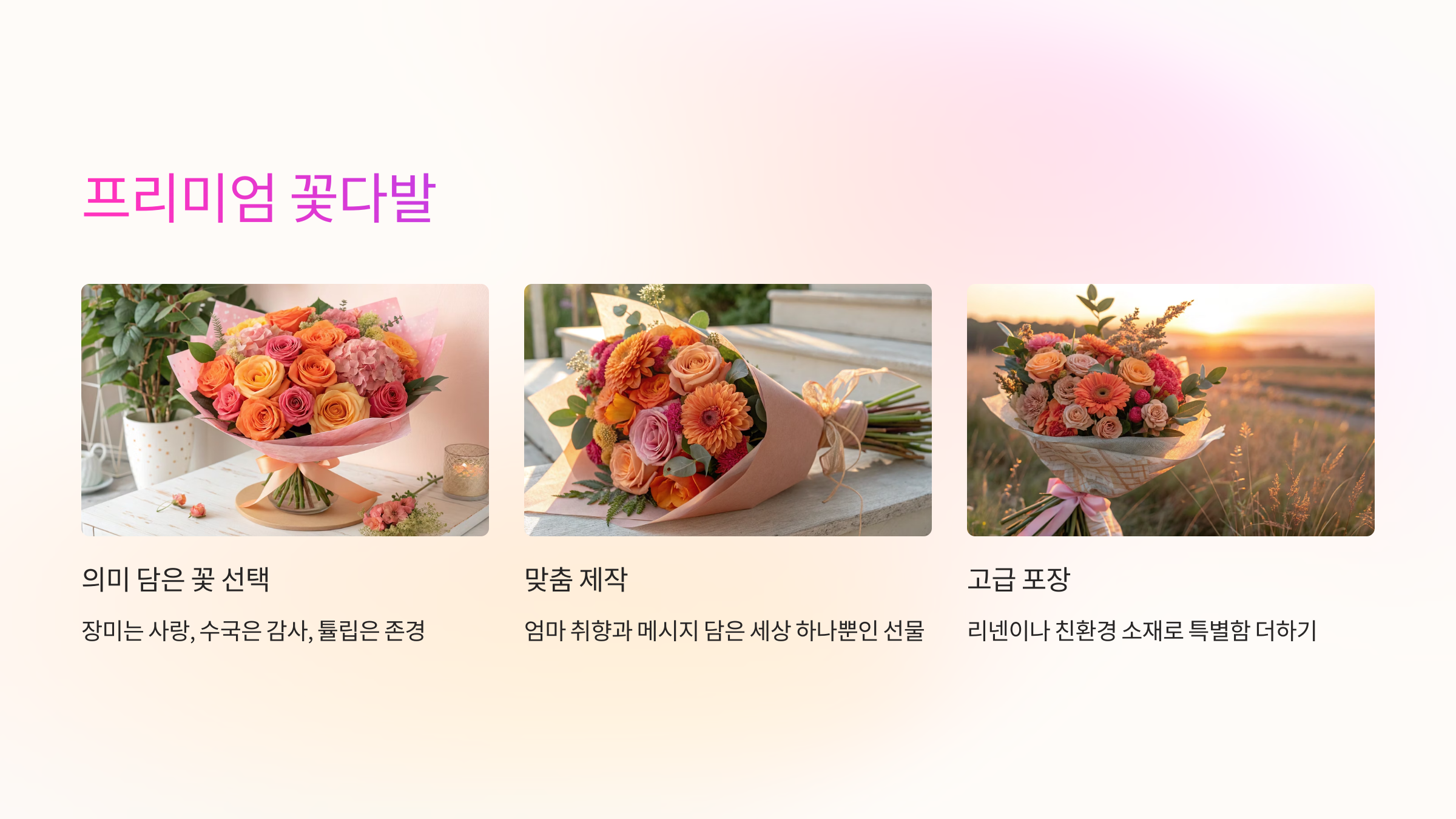 꽃은 언제나 사람을 행복하게 만들어주는 마법 같은 존재예요. 특히 엄마는 꽃을 보면 누구보다 환하게 웃으시잖아요. 요즘은 플로리스트가 직접 제작하는 프리미엄 꽃다발이 인기예요. 생화만 고르는 것이 아니라, 꽃에 의미를 담아 엄마의 인생과 추억을 표현할 수 있거든요.