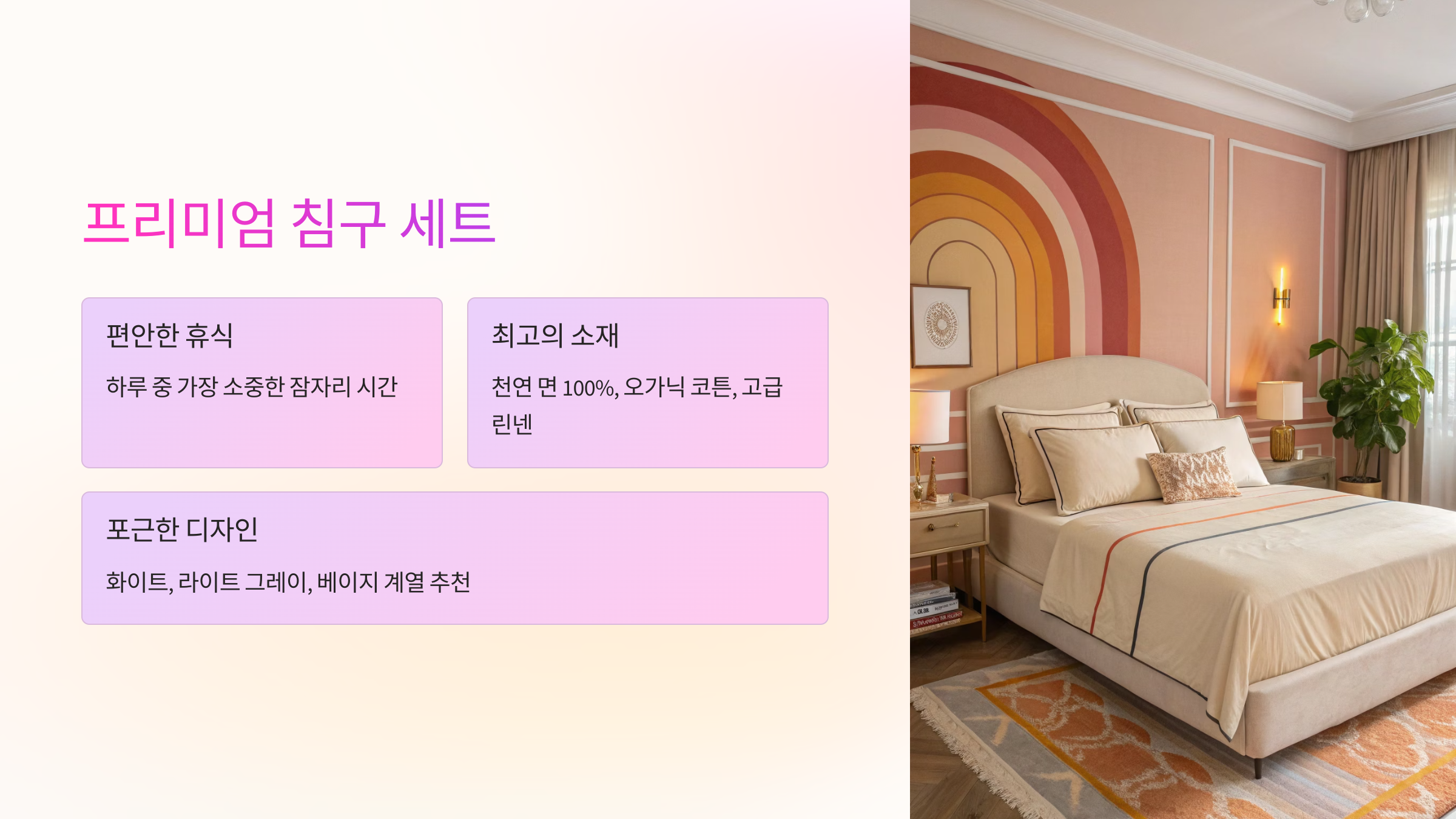 천연 면 100% 제품이나 오가닉 코튼, 고급 린넨 소재가 좋아요. 색상은 화이트, 라이트 그레이, 베이지 계열이 무난하고, 포근한 느낌을 주는 디자인이면 더욱 좋겠죠. 매일 밤 잠들기 전, 엄마가 따뜻함과 사랑을 느끼게 될 거예요. 🛌