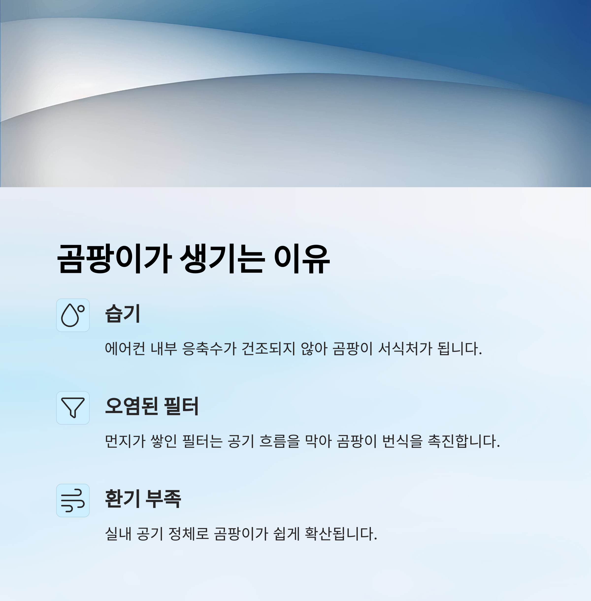 에어컨 내부에 곰팡이가 생기는 가장 큰 이유는 바로 ‘습기’예요. 에어컨은 냉방을 할 때 실내 공기를 차갑게 만들면서 습기를 응축시키는데요, 이 과정에서 생긴 물방울들이 내부에 남아 건조되지 않으면 곰팡이에게 완벽한 서식처가 되어버려요.