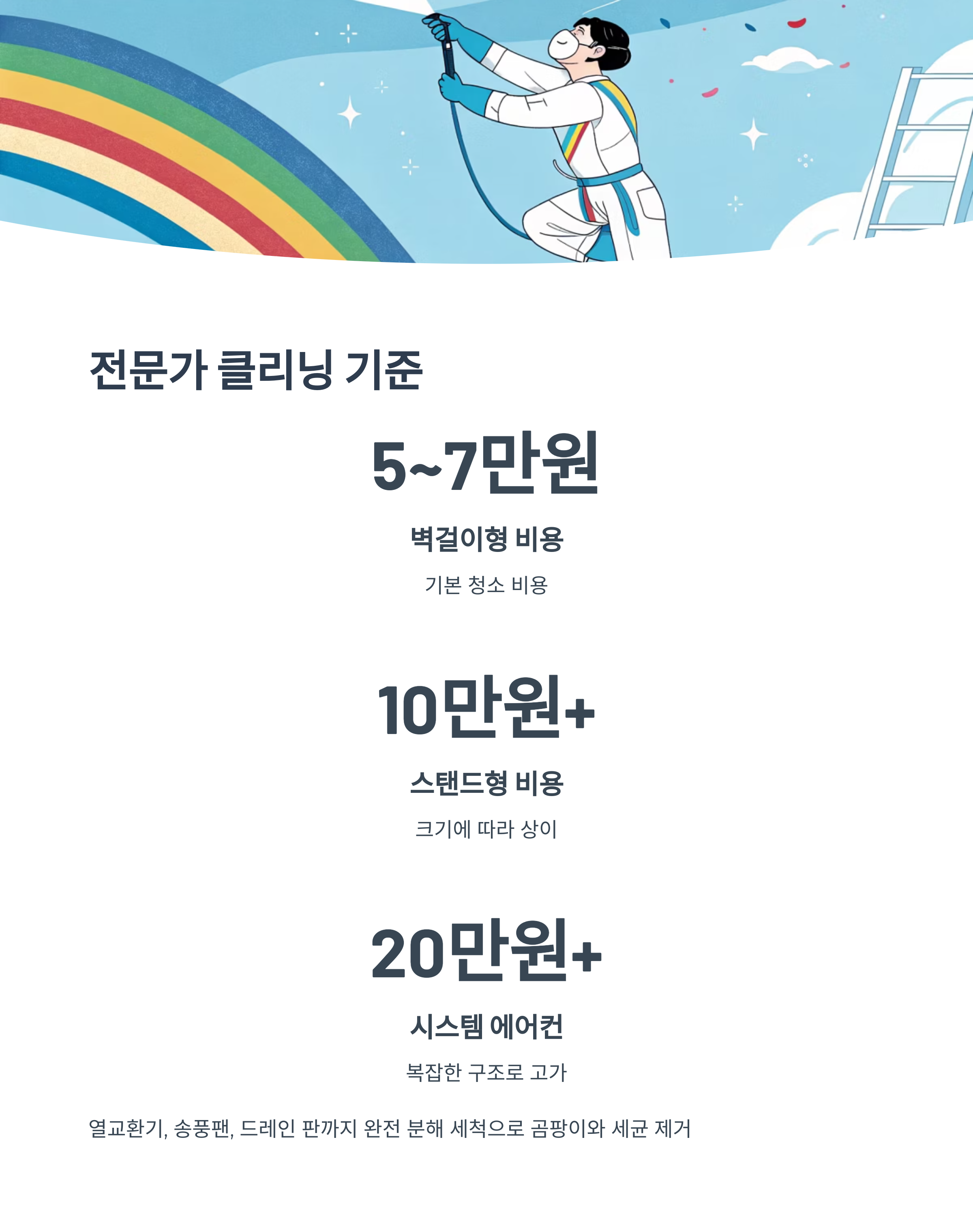 클리닝 비용은 종류와 크기에 따라 다르지만, 벽걸이형 기준으로 5~7만 원 선이에요. 스탠드형은 10만 원 이상, 시스템 에어컨은 20만 원대 이상도 나올 수 있어요. 조금 부담스럽긴 하지만 1년에 한 번 정도는 투자할 가치가 충분해요.