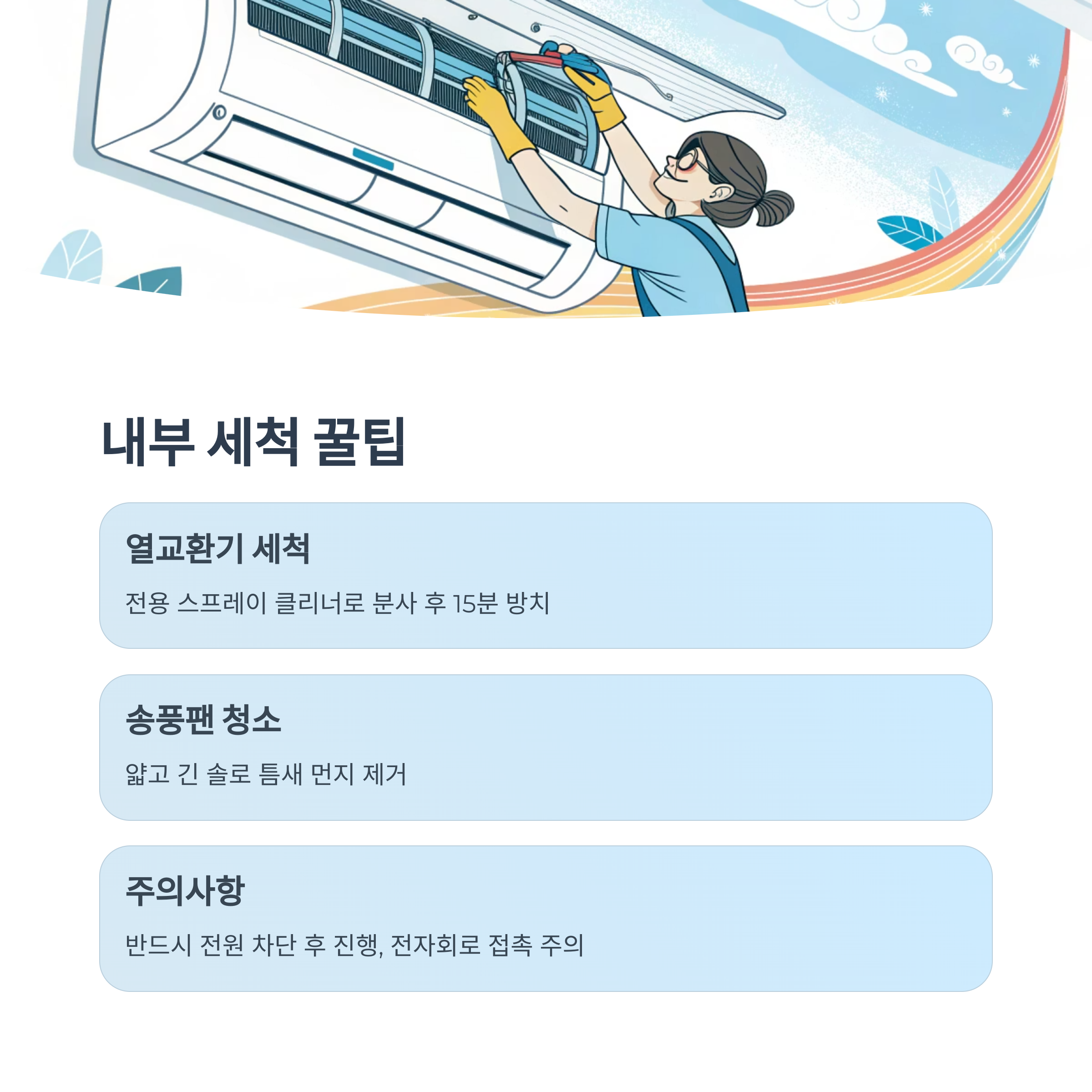 내부 세척은 연 1~2회 정도 해주면 좋아요. 특히 냉방을 많이 쓰는 여름 전후로 한 번씩 점검해주면 냄새도 사라지고 공기 질도 훨씬 좋아져요. 🎐