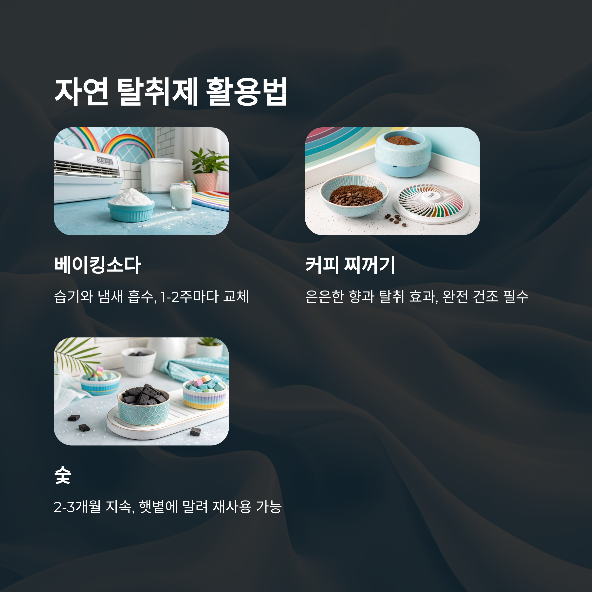 | 숯 | 장기 탈취 | 2~3개월 | 햇볕 말리기 필요 |