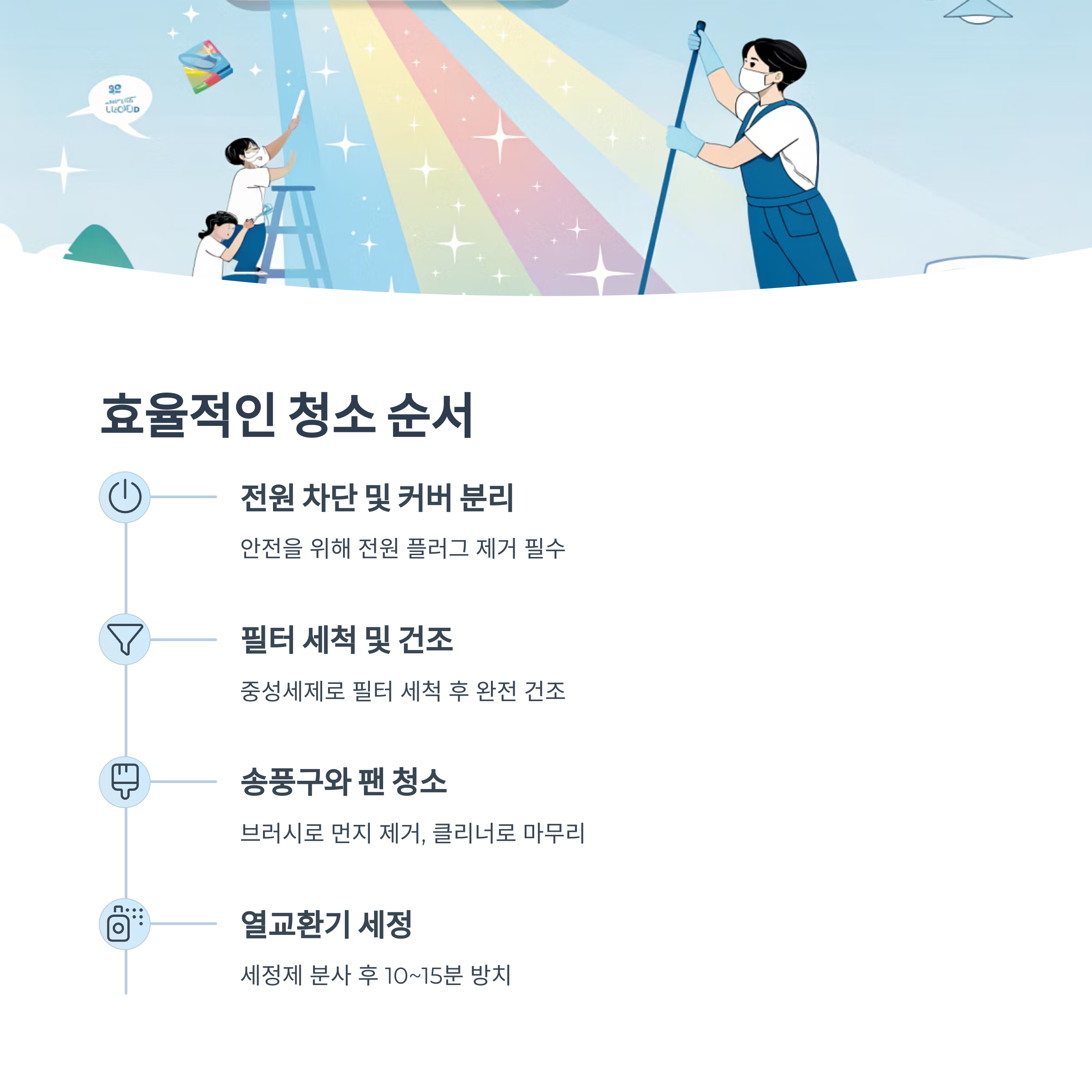 도구를 아무리 많이 갖췄다고 해도 순서 없이 청소하면 시간만 오래 걸리고 힘들기만 해요. 그래서 효율적인 순서를 알아두는 게 정말 중요해요. 특히 에어컨 청소는 '먼지 제거 → 세정 → 건조' 순서만 잘 지켜도 훨씬 쉽게 끝낼 수 있어요.