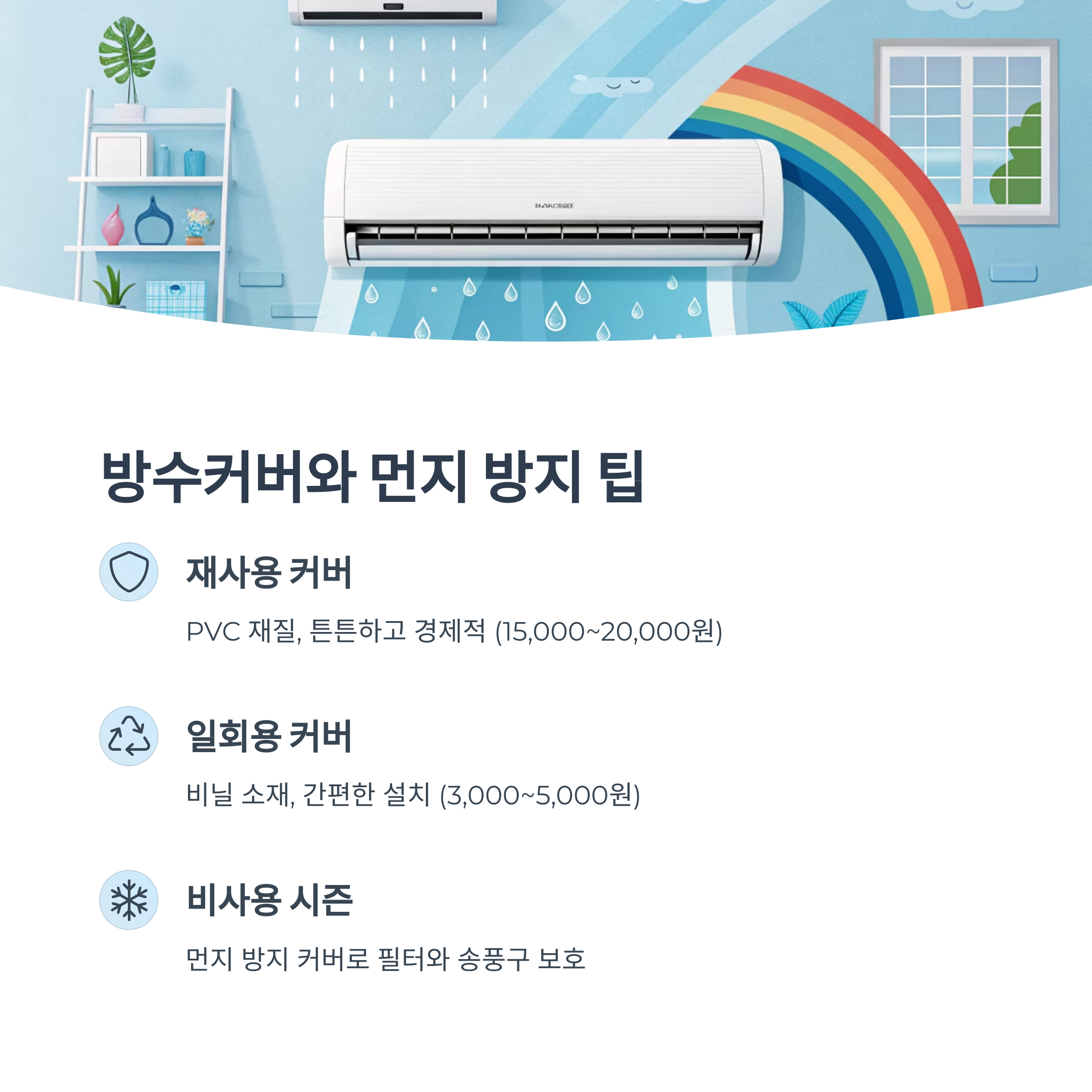 그리고 평소 에어컨을 사용하지 않을 때는 먼지가 쌓이지 않도록 전용 커버를 씌워두는 게 좋아요. 특히 겨울철엔 에어컨을 거의 사용하지 않기 때문에 이때 먼지 방지 커버를 씌워두면 필터나 송풍구에 먼지가 쌓이는 걸 방지할 수 있어요.