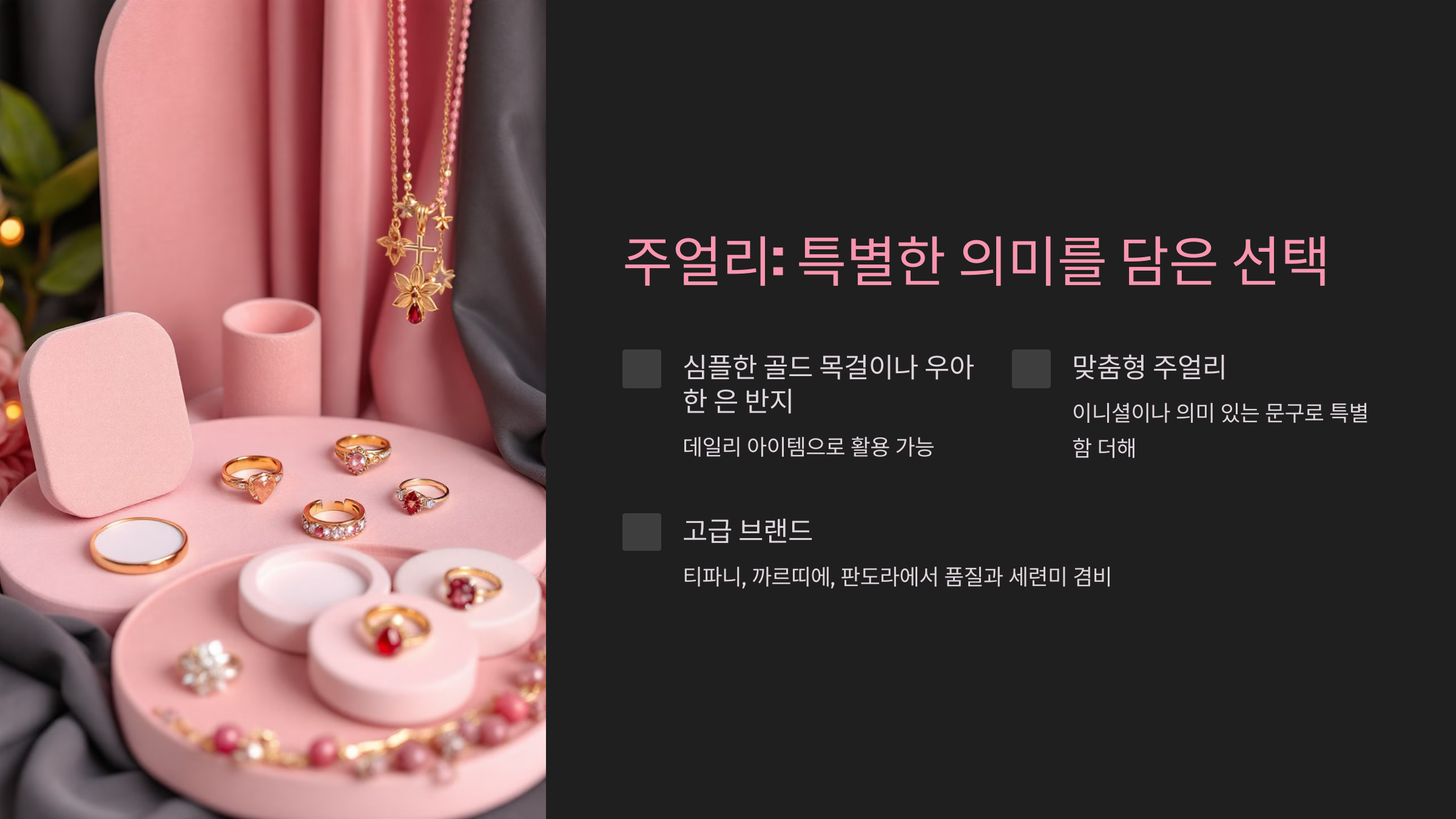 - 심플한 골드 목걸이나 우아한 은 반지는 어떤 스타일에도 잘 어울리며, 데일리 아이템으로도 부담 없이 활용할 수 있습니다.