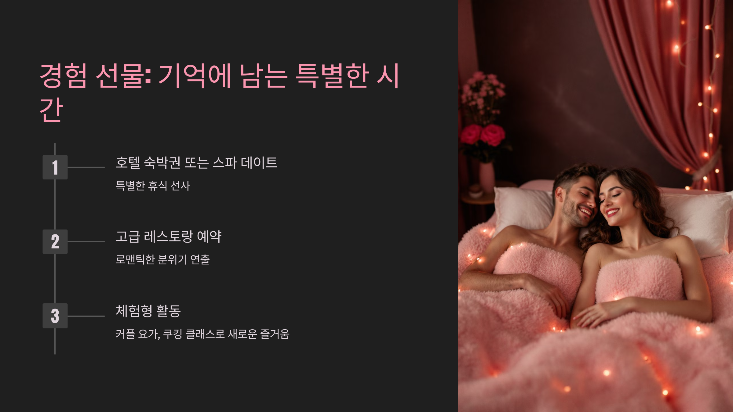 - 호텔 숙박권이나 스파 데이트는 스트레스 해소와 함께 특별한 휴식을 선사할 수 있습니다.