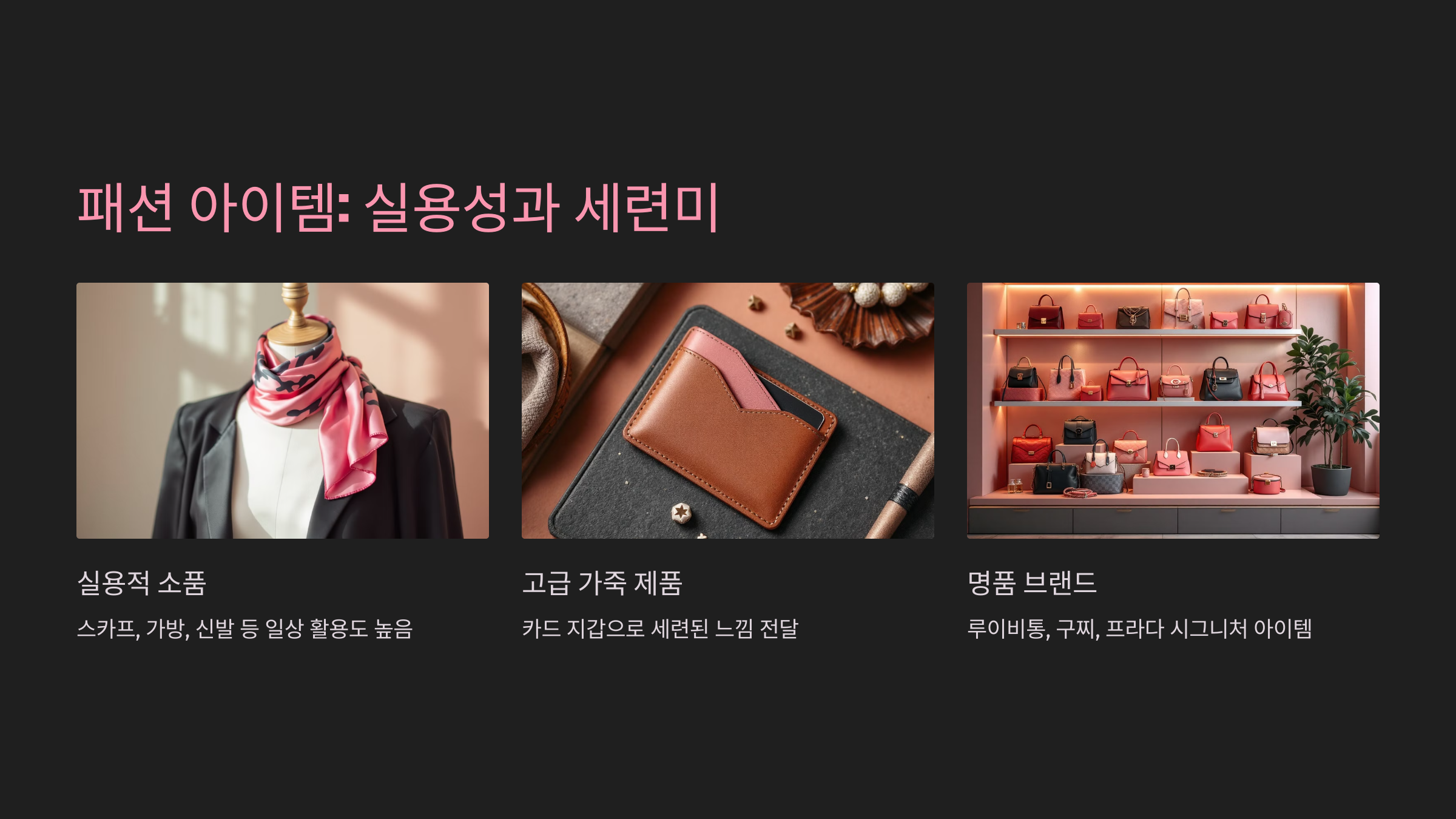 - 스카프, 가방, 신발 같은 실용적인 패션 소품은 일상에서 자주 활용할 수 있어 만족도가 높습니다.