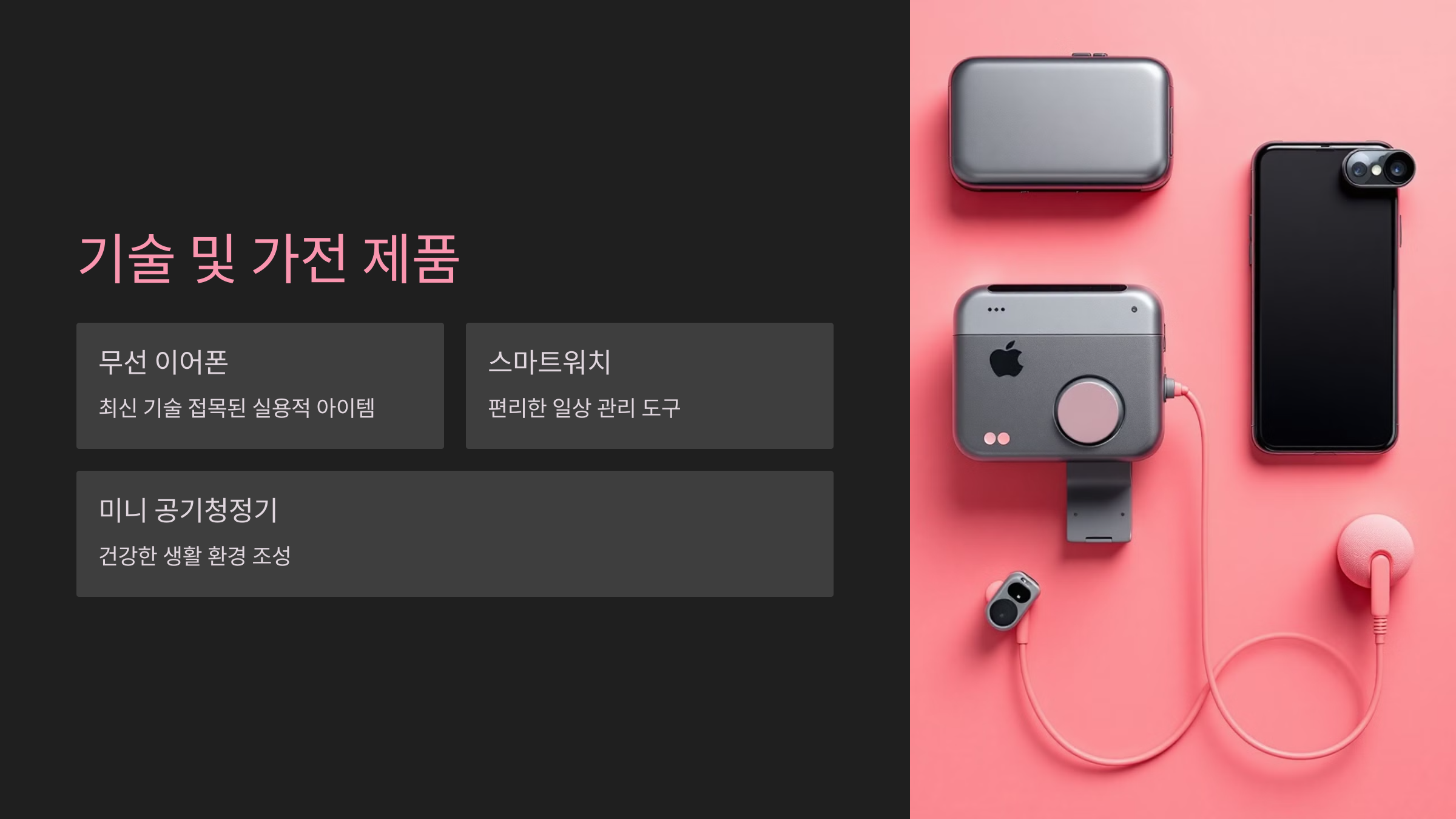 - 무선 이어폰, 스마트워치, 미니 공기청정기 등 최신 기술이 접목된 제품을 고려해보세요.