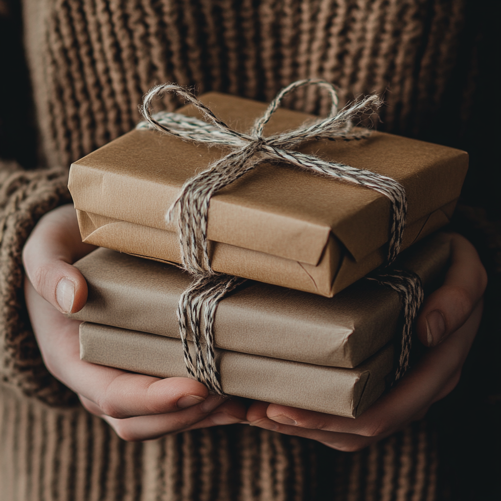 친환경 포장지나 재사용 가능한 가방, 또는 심플한 포장지와 리본으로 꾸미는 것이 세련되고 감각적입니다.