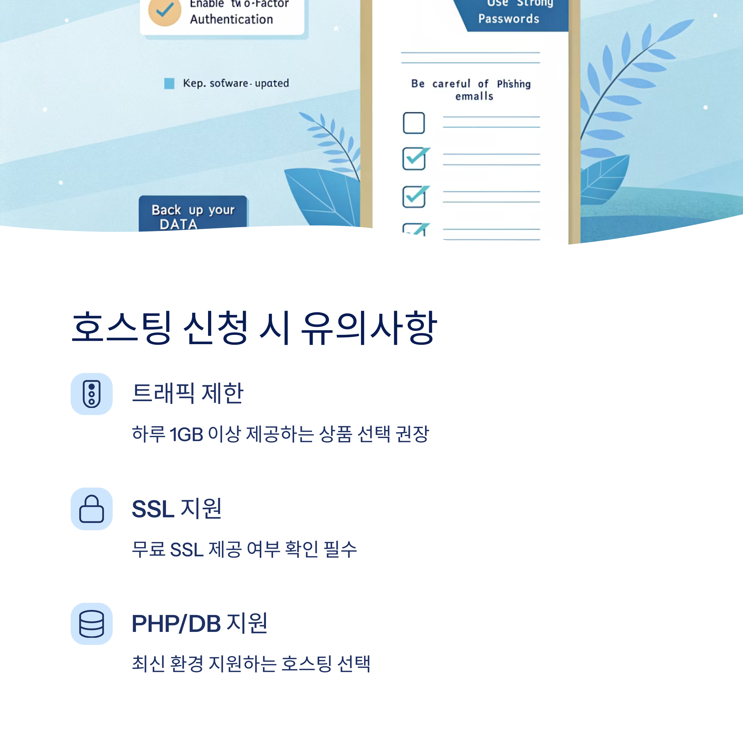 웹호스팅을 신청할 때 몇 가지 주의할 점도 함께 알아두면 좋아요. 특히 처음 시작할 때 실수하기 쉬운 부분들이 있어서 체크리스트처럼 확인해보는 걸 추천해요.