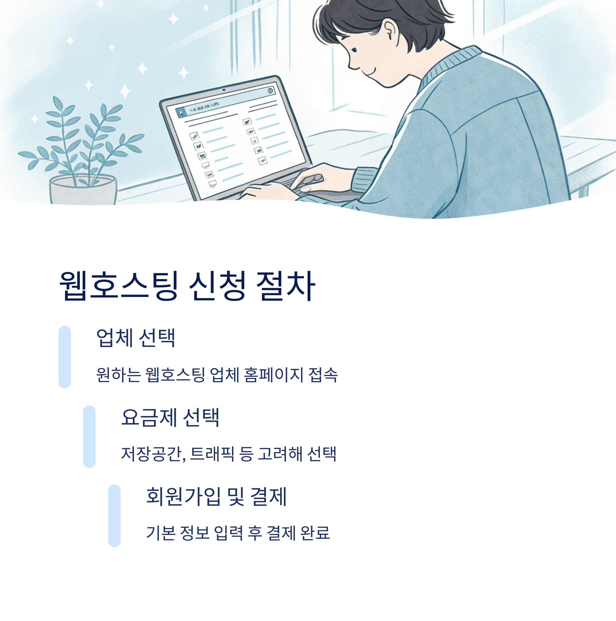 웹호스팅 신청은 생각보다 아주 간단해요! 대부분의 웹호스팅 업체들은 몇 단계만 거치면 바로 서비스 이용이 가능하도록 시스템을 구축해두었답니다. 처음이라도 겁먹지 마세요. 지금부터 단계별로 알려드릴게요.