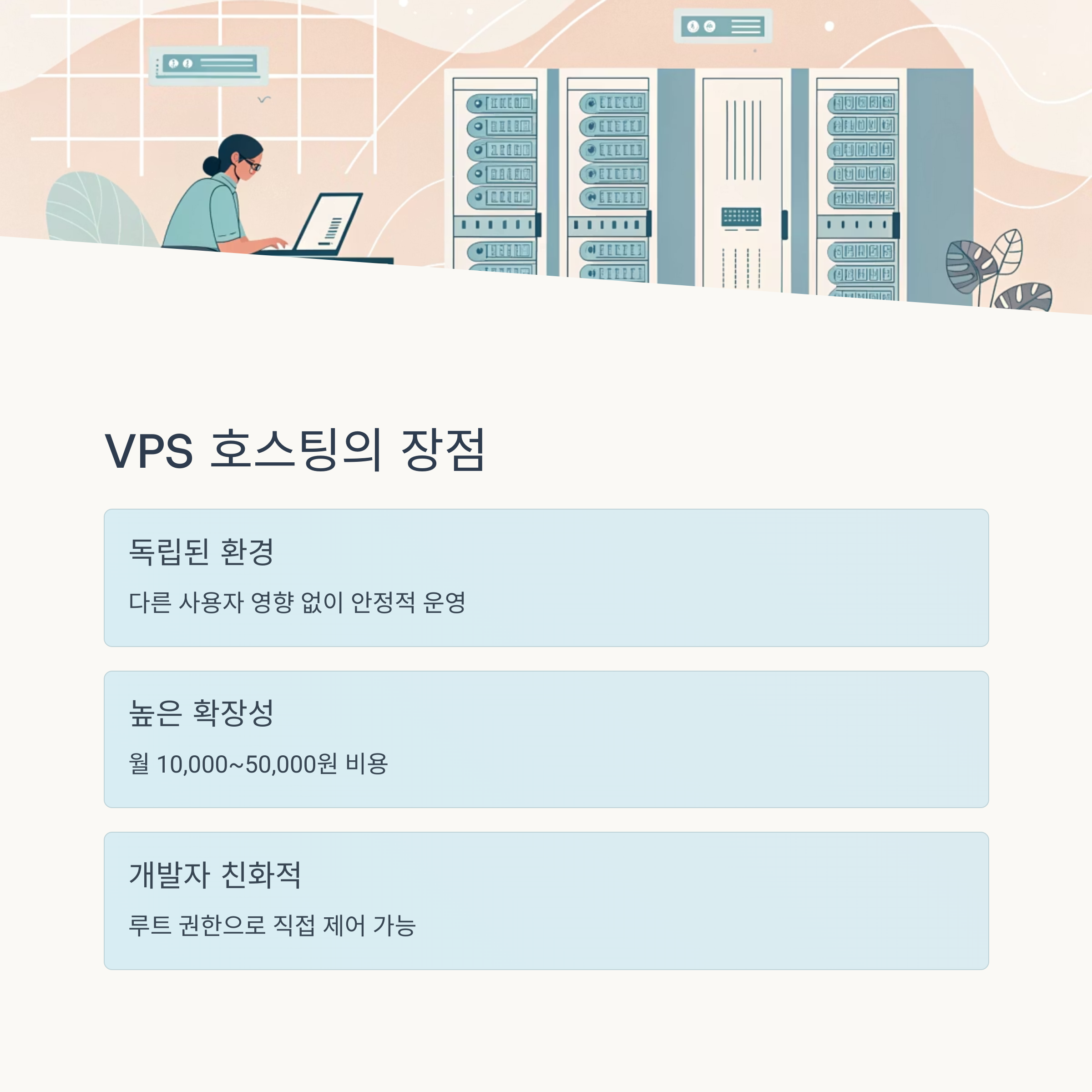 운영체제를 개별적으로 설치할 수 있고, 루트 권한도 부여받기 때문에 개발자나 웹 서버를 직접 제어하고자 하는 사용자에게 적합해요. 비용은 공유 호스팅보다 비싸지만 전용 서버보다는 저렴해서 가성비가 좋아요.