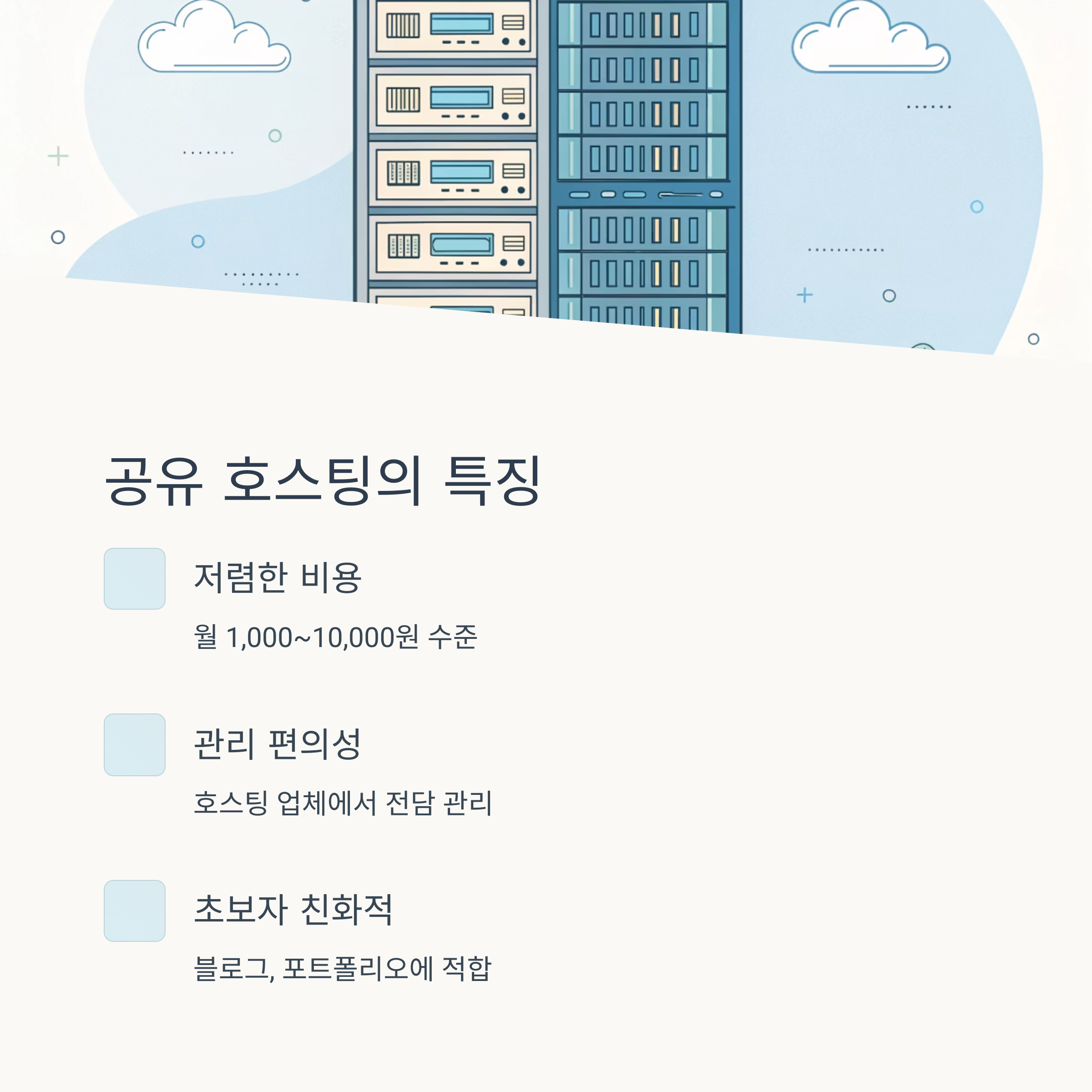 공유 호스팅은 가장 기본적이고 대중적인 웹호스팅 형태예요. 여러 사용자가 하나의 서버 자원을 나누어 쓰는 방식으로, 비용이 저렴하다는 장점이 있어요. 서버 유지관리와 보안 설정 등은 호스팅 업체에서 모두 관리해줘서 초보자에게 적합하죠.