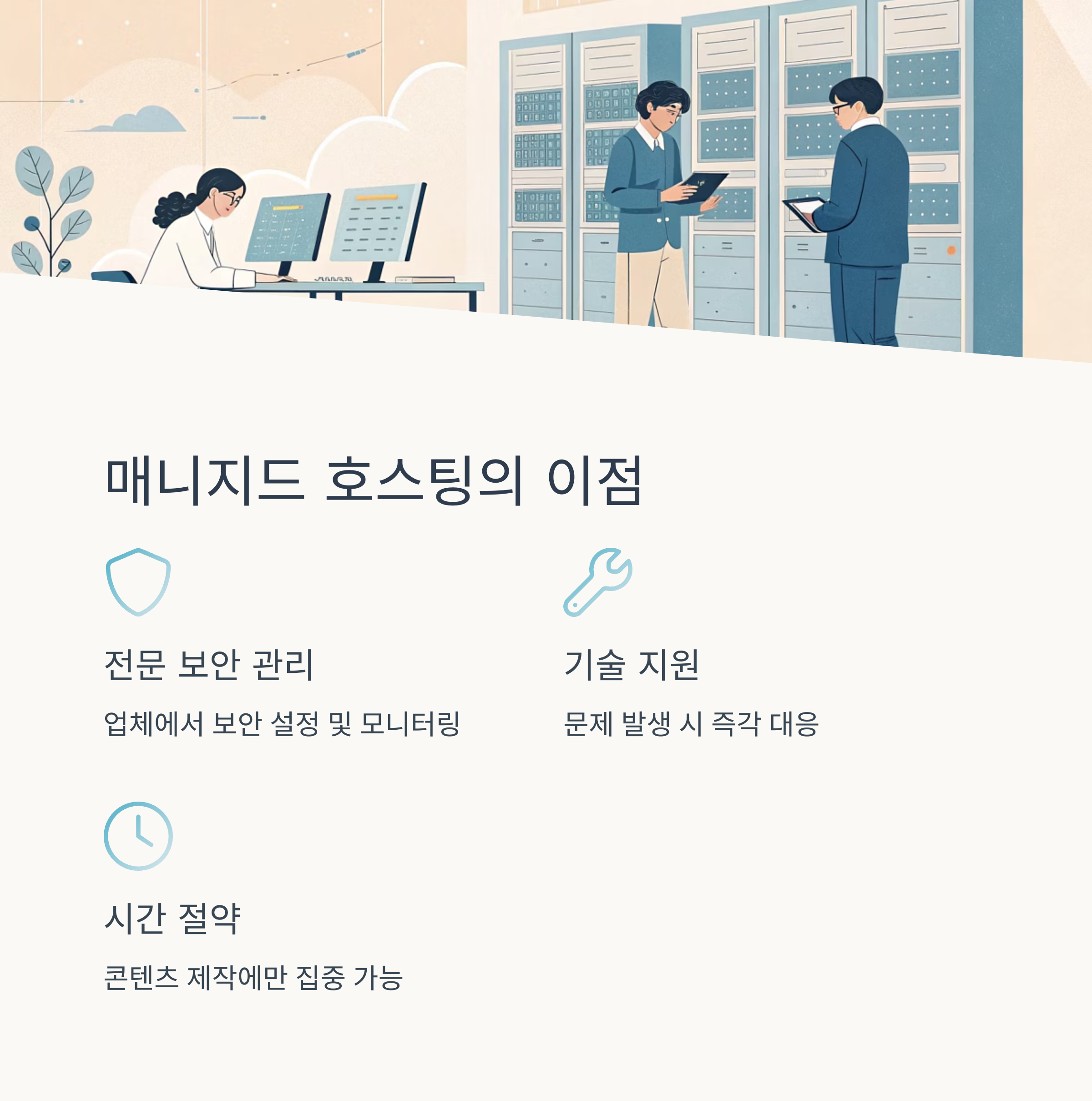 매니지드 호스팅은 서버의 모든 기술적인 부분을 호스팅 제공업체가 대신 관리해주는 서비스예요. 서버 설치, 업데이트, 보안 패치, 백업까지 모두 맡길 수 있어서 웹사이트 운영에만 집중할 수 있답니다.