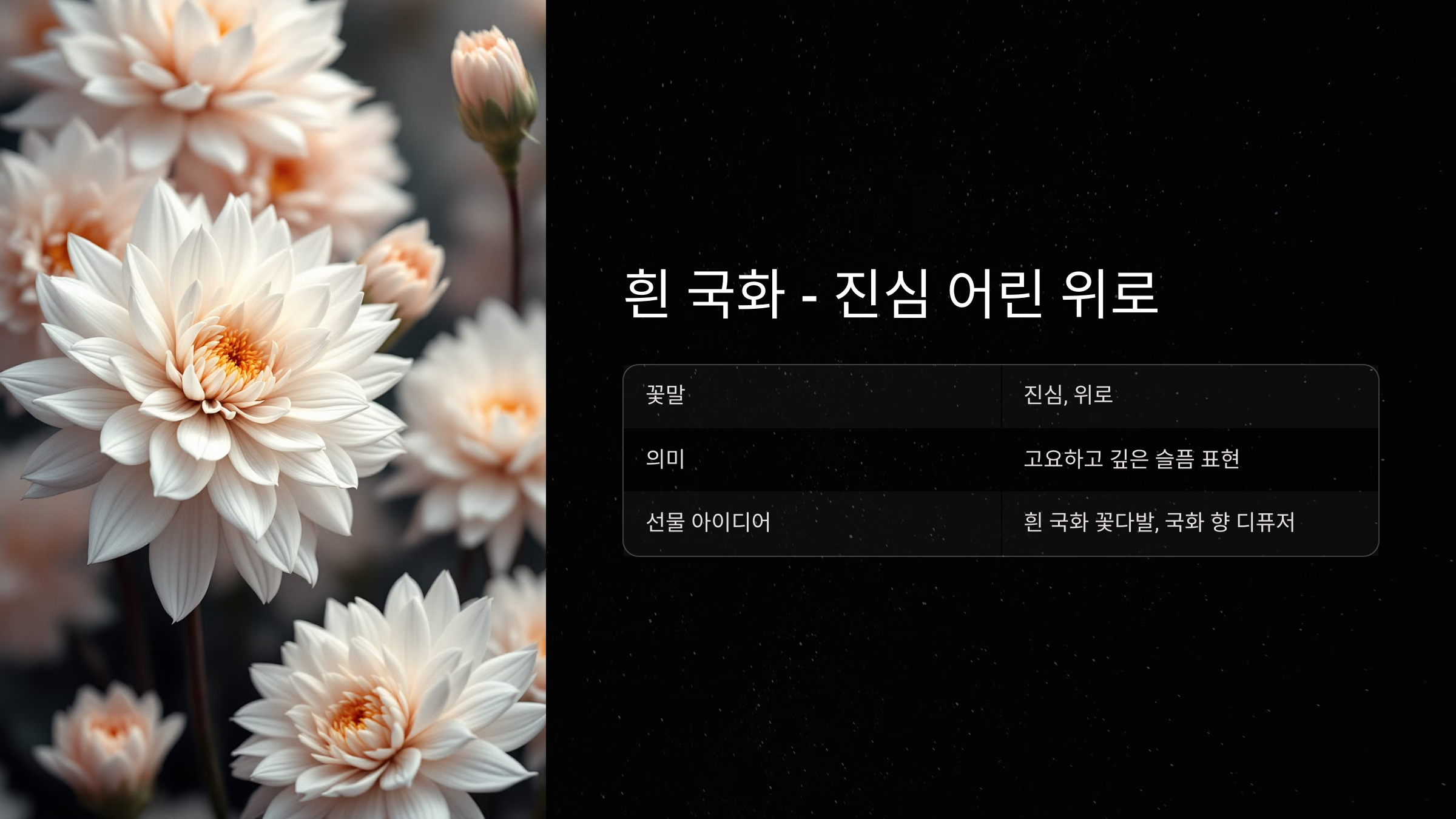 꽃말: 흰 국화는 ‘진심’과 ‘위로’를 의미하며, 고요하고 깊은 슬픔을 표현합니다.