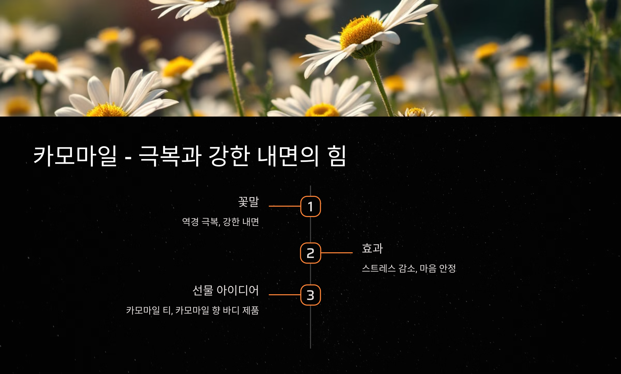 꽃말: 카모마일은 ‘역경을 극복하는 힘’과 ‘강한 내면’을 상징합니다.