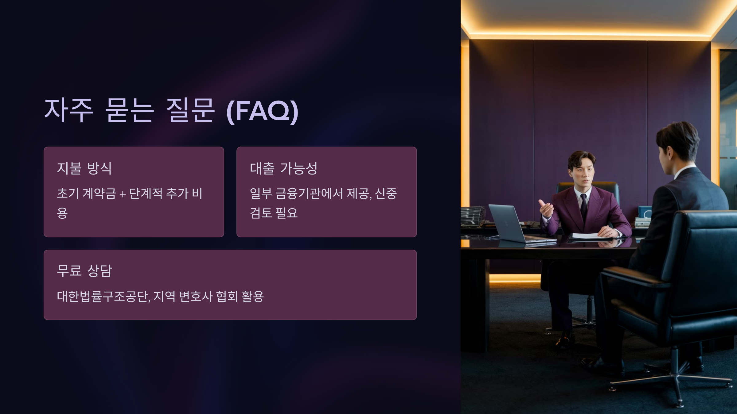 A1. 대부분 초기 계약금 형태로 일정 금액을 선지급하고, 소송 진행 상황에 따라 단계적으로 추가 비용을 지불하는 구조를 사용해요.