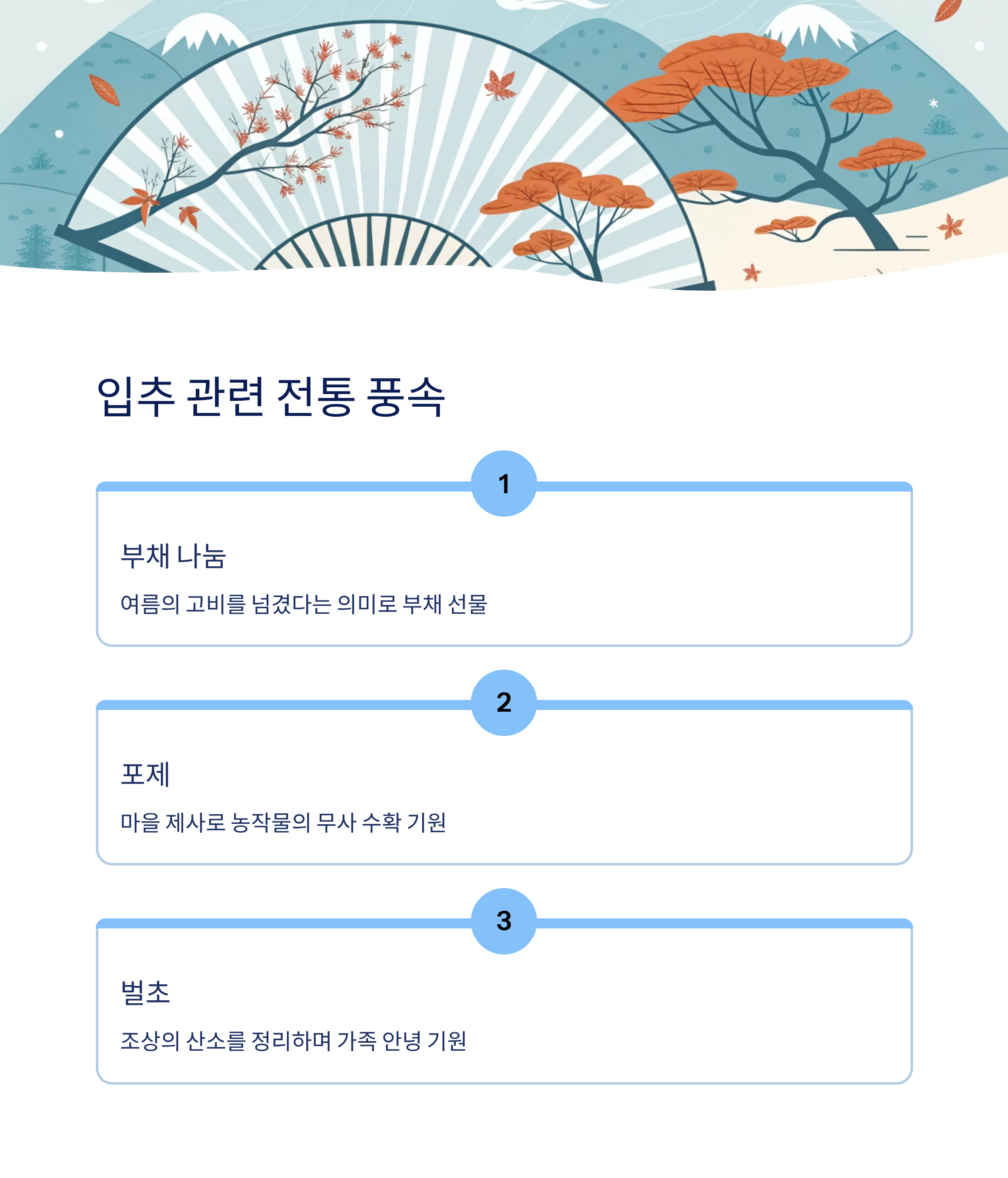 대표적인 풍속 중 하나는 '입추 부채 나눔'이에요. 입추가 되면 더위 속에서도 "이제는 가을이다"라며 선비들이 서로에게 부채를 선물했는데요, 이것은 ‘여름의 고비를 넘겼다’는 뜻이었어요. 또한 이 부채에는 복을 기원하는 글귀를 적어 정성을 담았답니다.