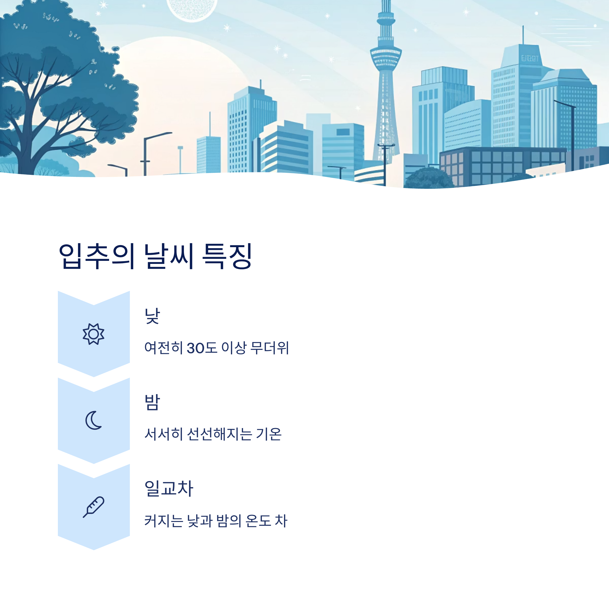기상청의 예측에 따르면 2025년 입추 전후로는 북태평양 고기압이 우리나라에 영향을 계속 줄 가능성이 있어 무더위가 길어질 수 있어요. 하지만 밤에는 제법 선선한 바람이 불고, 낮과 밤의 기온 차도 커지기 시작해요. 환절기 증상이 나타날 수 있는 시기이기도 하니 건강 관리도 중요해요.