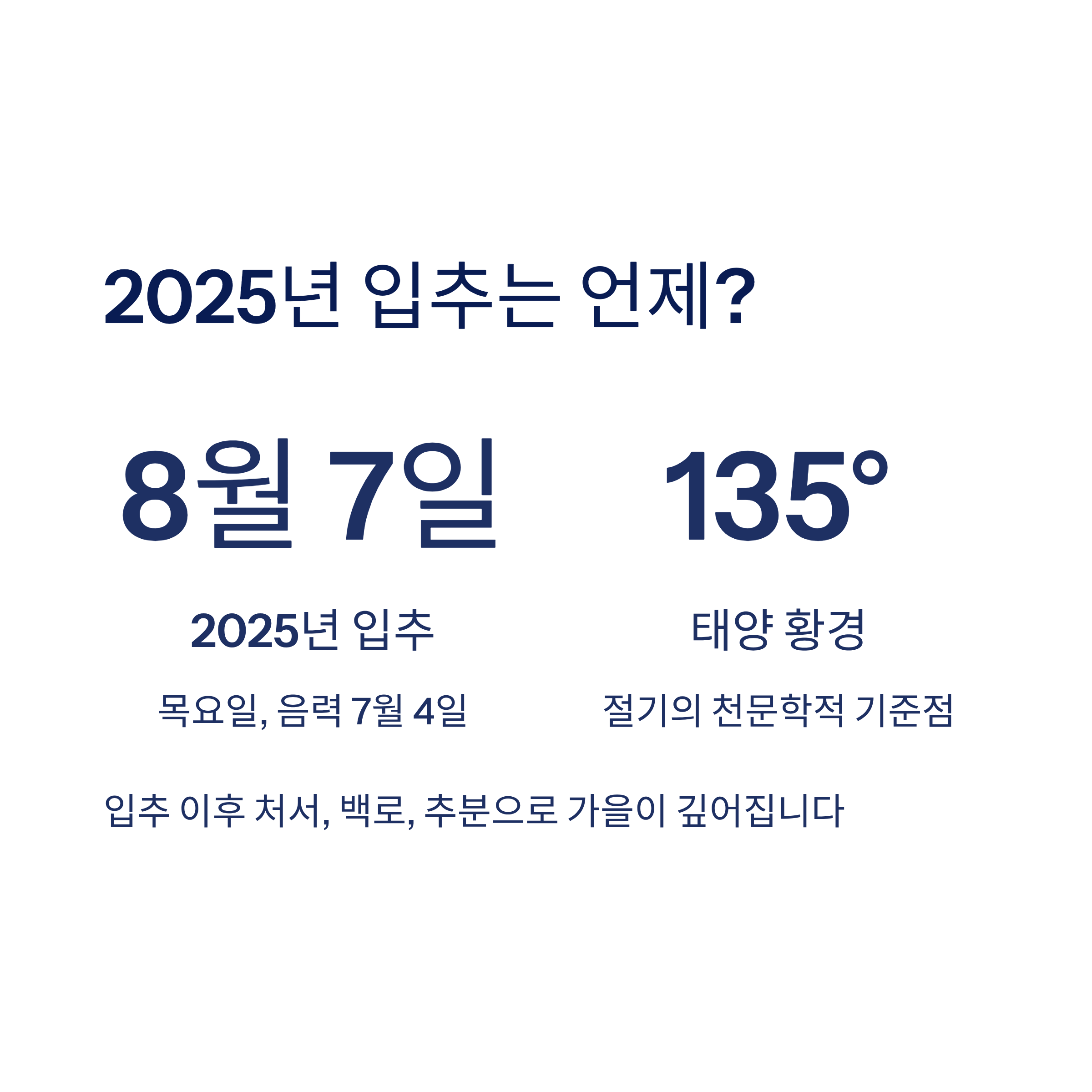 2025년 절기력을 보면 입추 이후로는 8월 23일 ‘처서’가 오고, 9월 7일에는 ‘백로’, 9월 22일 ‘추분’이 이어져요. 이런 절기들은 모두 가을의 흐름을 정리하고 있어요. 입추는 그 첫 시작이죠!