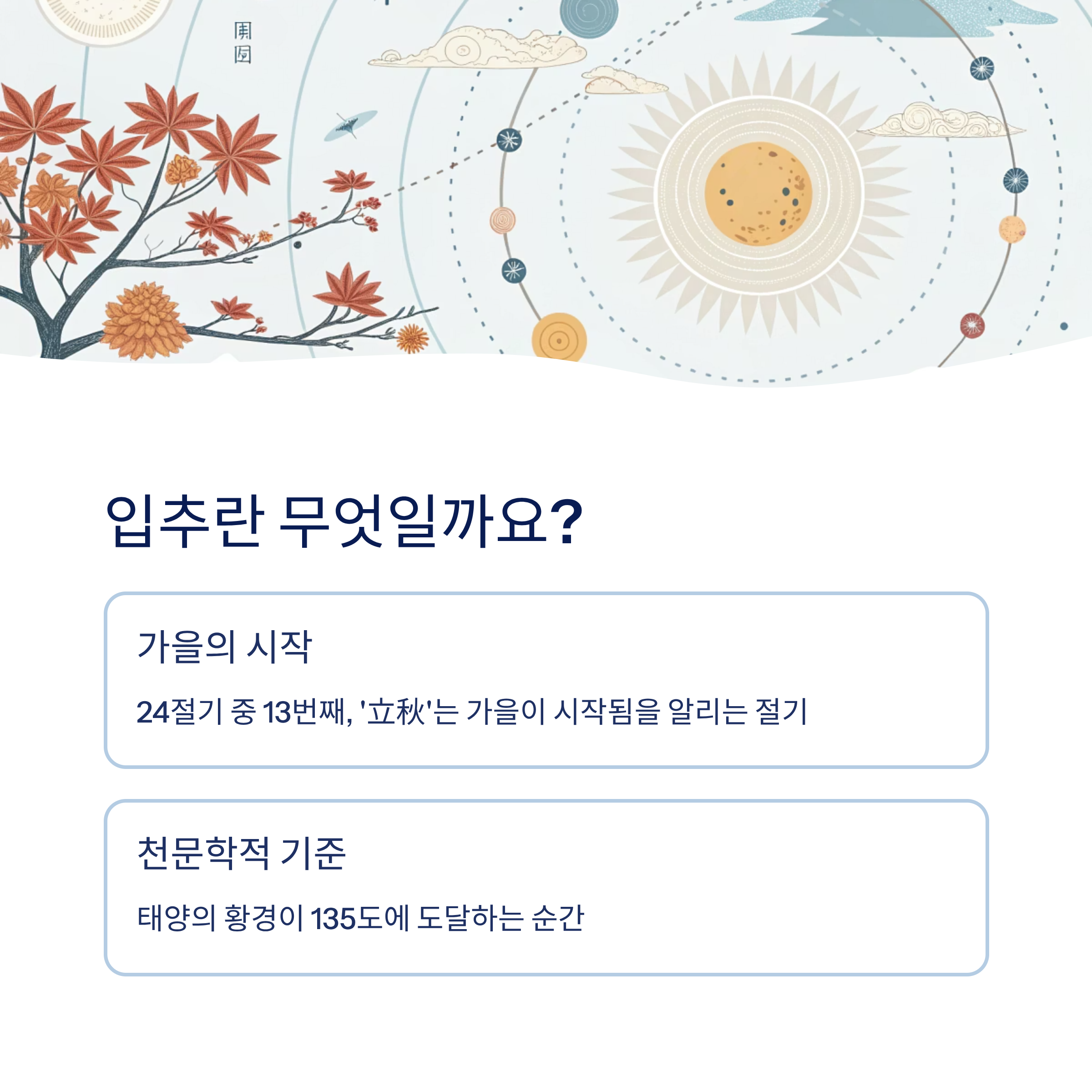 태양의 황경이 135도에 도달하는 순간을 입추로 정하고 있어요. 이 시점은 천문학적으로도 계절 전환점이에요. 입추 다음에는 처서, 백로, 추분 같은 본격적인 가을 절기가 이어지는데요, 농작물 성장과 수확에 맞춘 체계적인 절기예요.