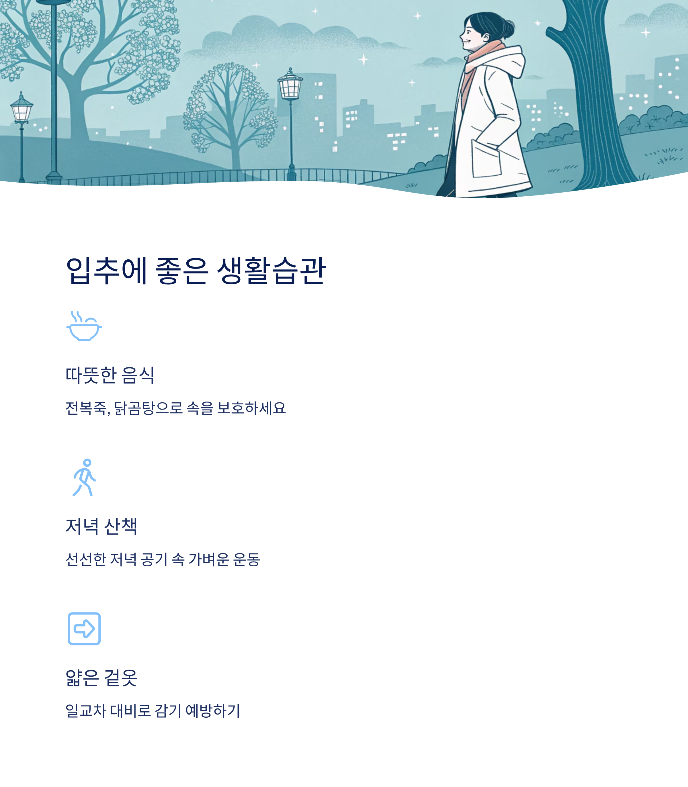 | 식습관 | 따뜻한 국물 음식 | 속을 보호하고 에너지 회복 |