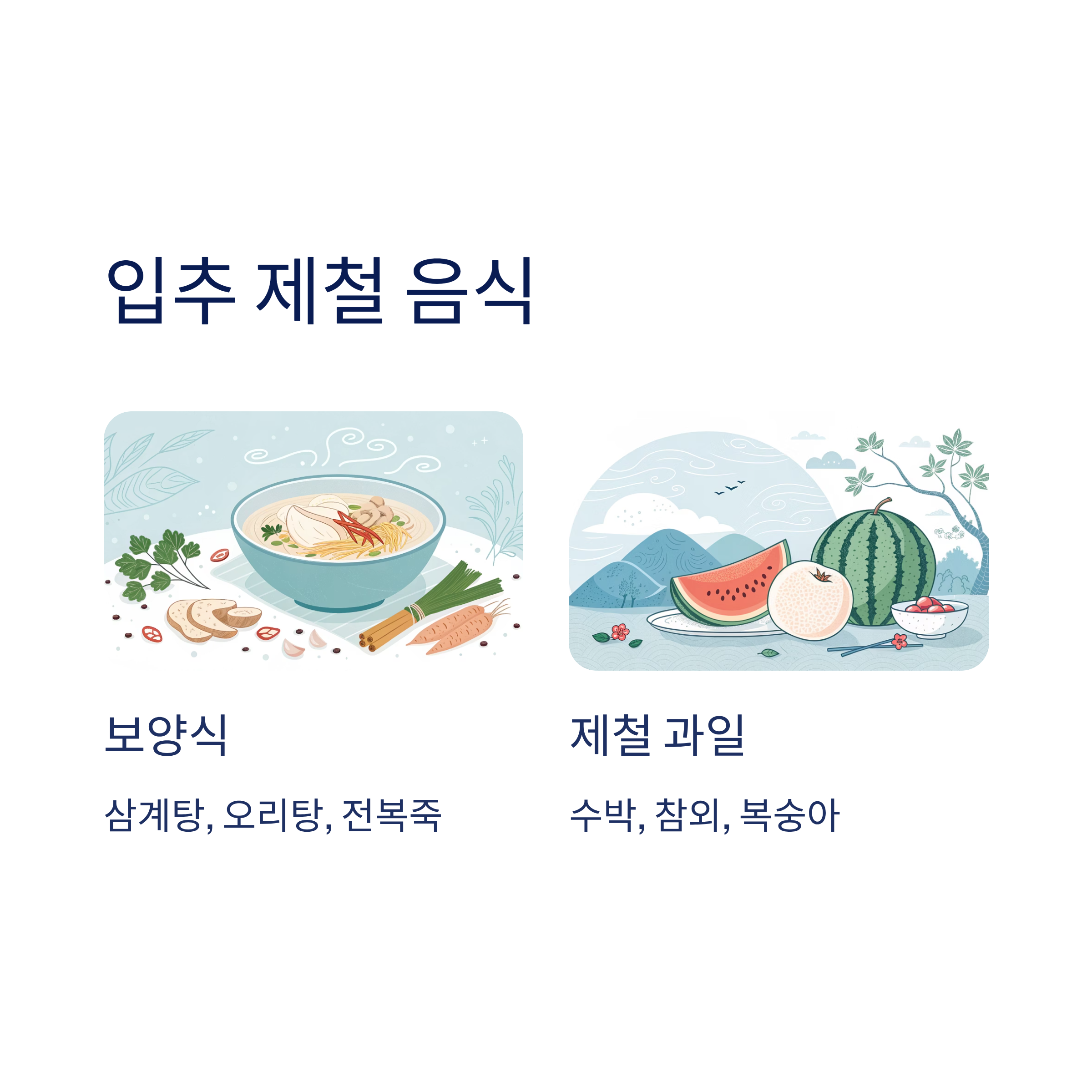 입추는 계절이 바뀌는 시점이라 음식도 변화하는데요, 이때가 되면 여름철 더위에 지친 몸을 보양하는 음식이 특히 인기를 끌어요. 대표적인 제철 음식으로는 수박, 참외, 복숭아 같은 과일류가 있고, 영양을 보충해주는 삼계탕, 오리탕, 전복죽도 많이 먹어요.
