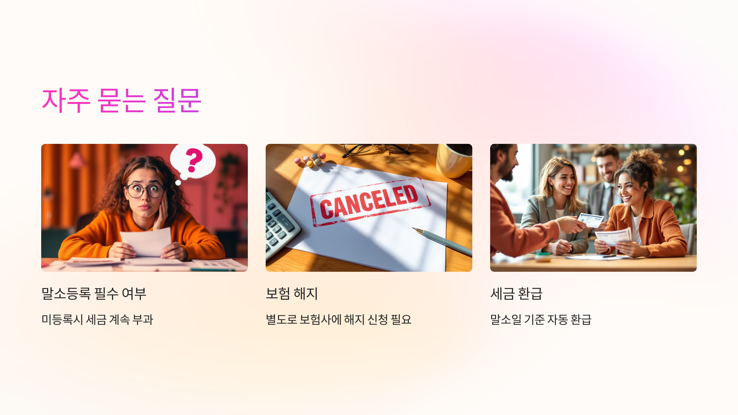 A5. 아니요, 별도로 보험사에 해지 신청을 해야 해요. 차량 말소와 보험 해지는 연동되지 않아요.