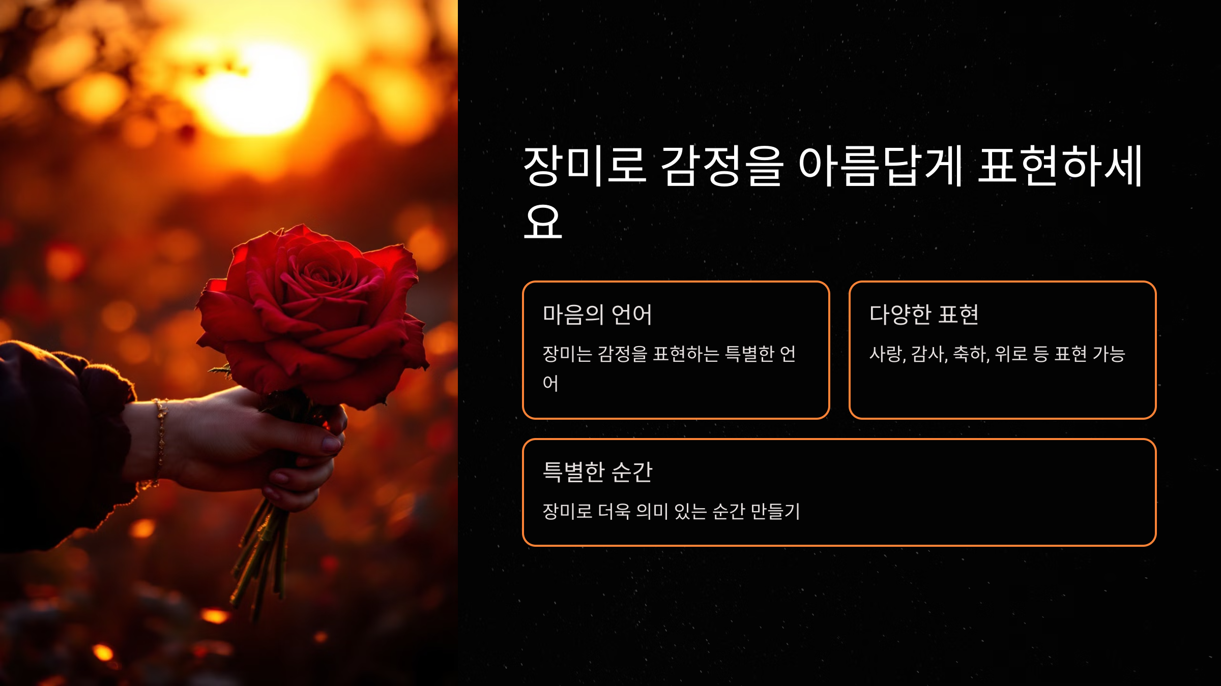 👉 활용 팁:- 한 송이의 빨간 장미는 "나의 유일한 사랑"이라는 의미를 담습니다.