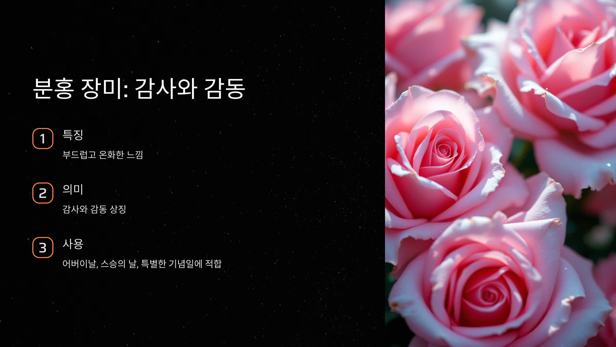 분홍 장미는 감사와 감동을 상징합니다. 다른 장미보다 부드럽고 온화한 느낌을 주어 감사의 마음을 전하거나, 감사의 뜻을 전하고 싶을 때 사용하면 좋습니다. 연한 분홍 장미는 우아함과 사랑스러운 매력을 담고 있어, 받는 사람의 마음에 잔잔한 감동을 선사할 수 있습니다.