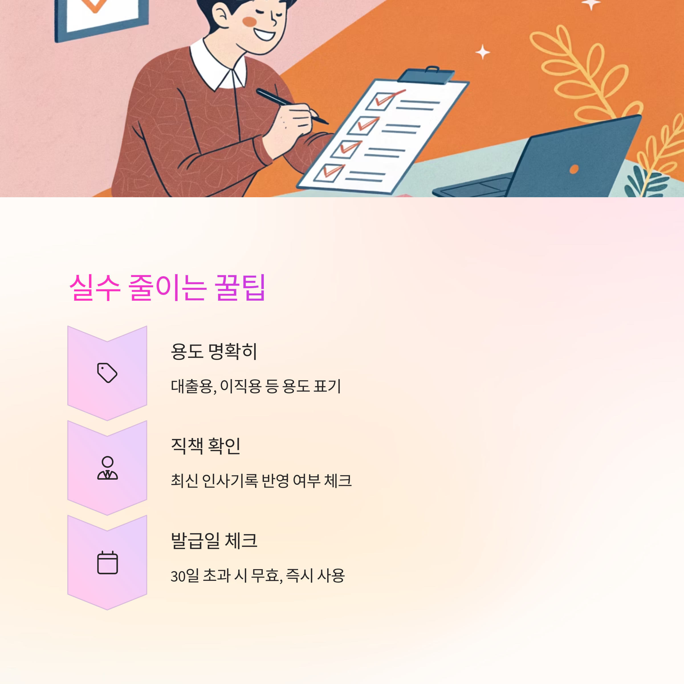첫 번째는 ‘용도 누락’이에요. 대출용인지, 이직용인지 명확하게 표시하지 않으면 발급 담당자가 기본 양식으로만 처리해서 다시 제출해야 할 수도 있어요.