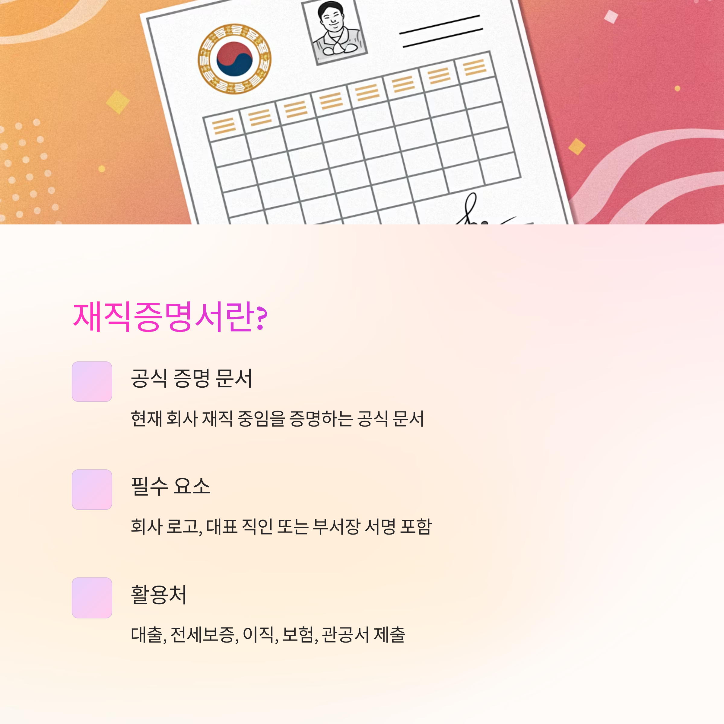 | 재직증명서 | 재직 중인 직원 | 은행, 공공기관 제출용 | 재직 중에만 유효 |
