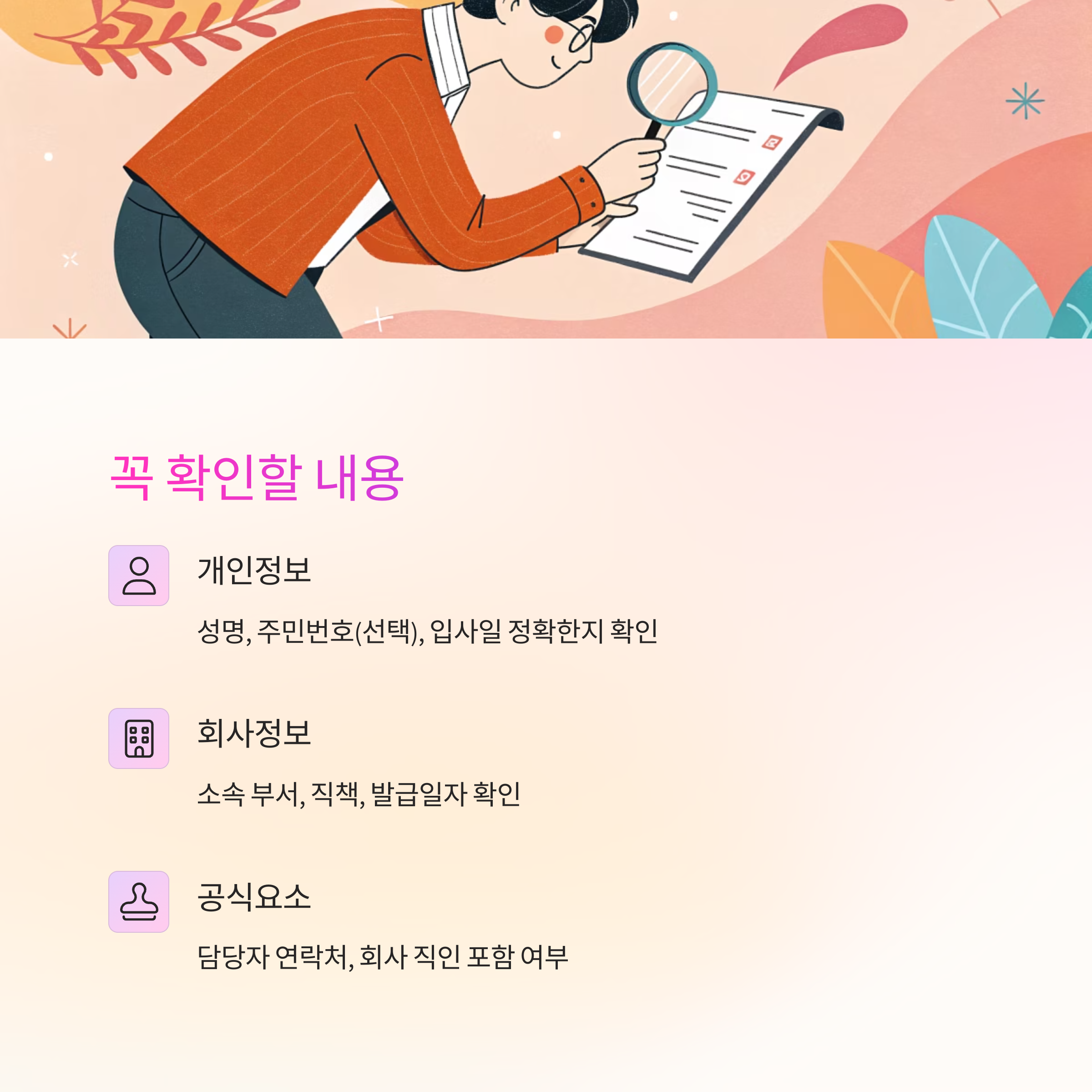 재직증명서를 처음 발급받는 사람이라면 흔히 하는 실수가 있어요. 미리 알아두면 실수하지 않고 깔끔하게 처리할 수 있답니다!