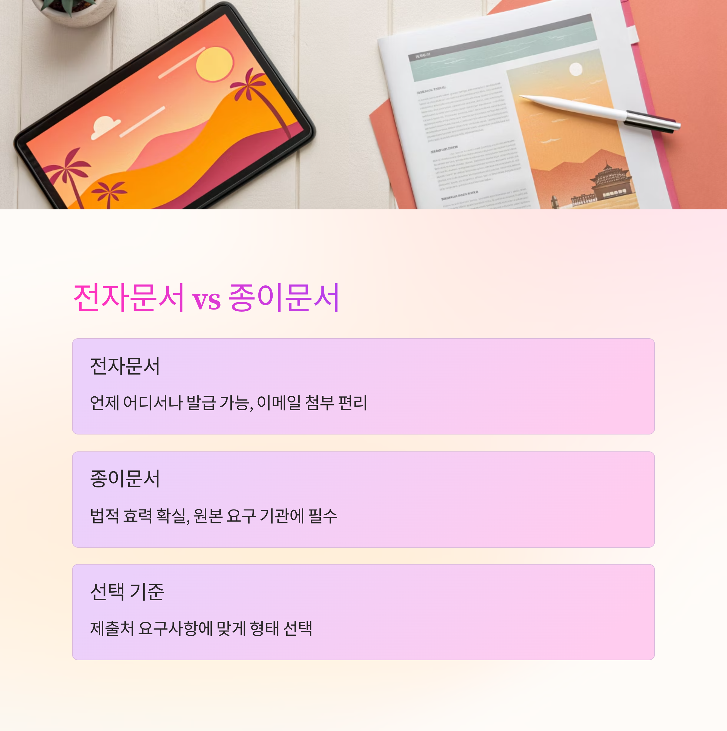 필요한 용도에 따라 전자문서와 종이문서를 적절히 활용하는 센스가 필요해요. 두 가지 중 어떤 걸 선택해도 공식적인 효력이 인정받는 게 중요하겠죠! 🧾