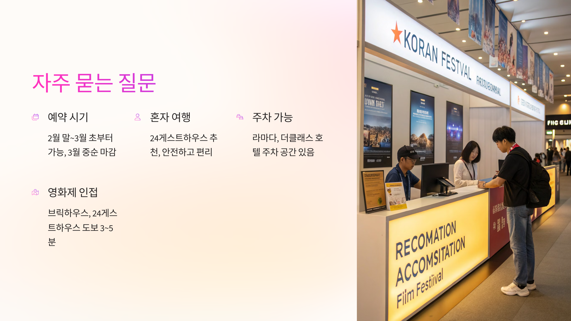 A1. 보통 영화제 일정이 발표되는 2월 말~3월 초부터 예약이 열려요. 인기 숙소는 3월 중순이면 대부분 마감되니, 3월 말 이전 예약을 추천해요.