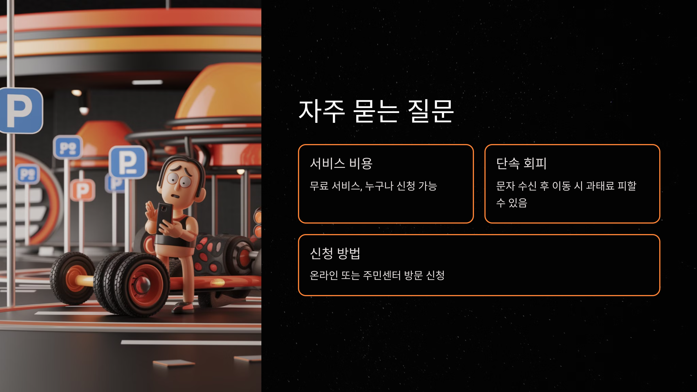 🚦 단속 대상 지역에서 일정 시간 이상 차량이 감지되면, 실시간으로 문자 메시지가 발송돼요. 문자 수신 후 즉시 이동하면 과태료를 피할 수 있어요.