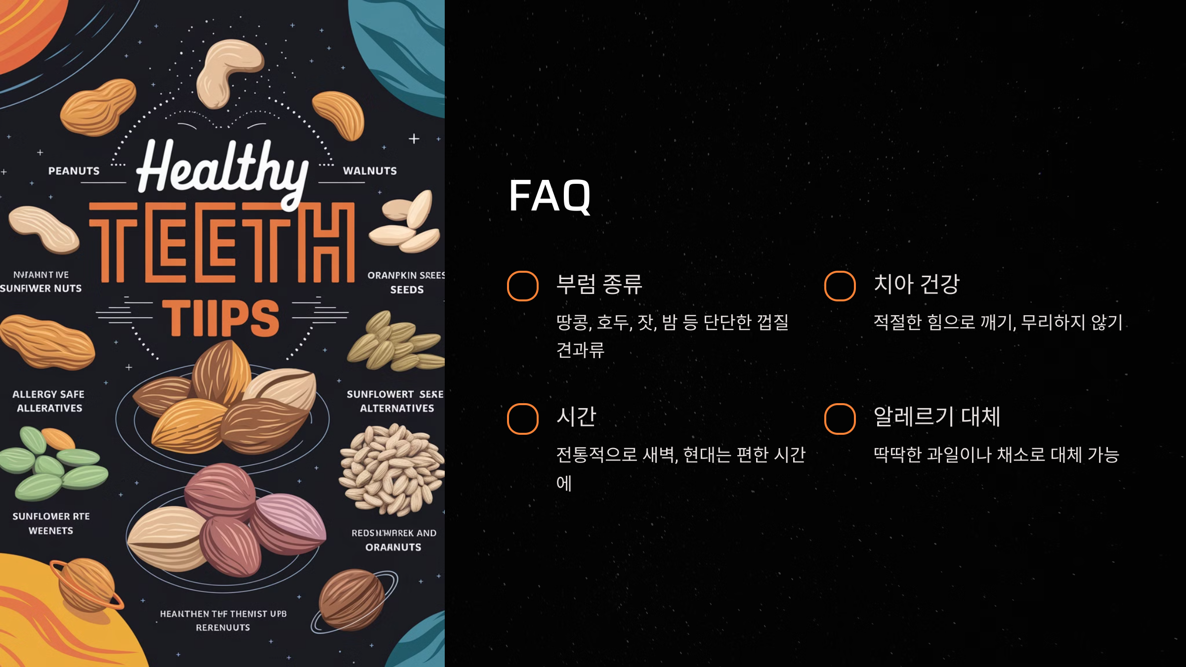 A2. 적절한 힘으로 부럼을 깨면 치아 건강에 도움이 되지만, 너무 단단한 껍질을 무리하게 깨면 치아에 부담이 될 수 있어요.