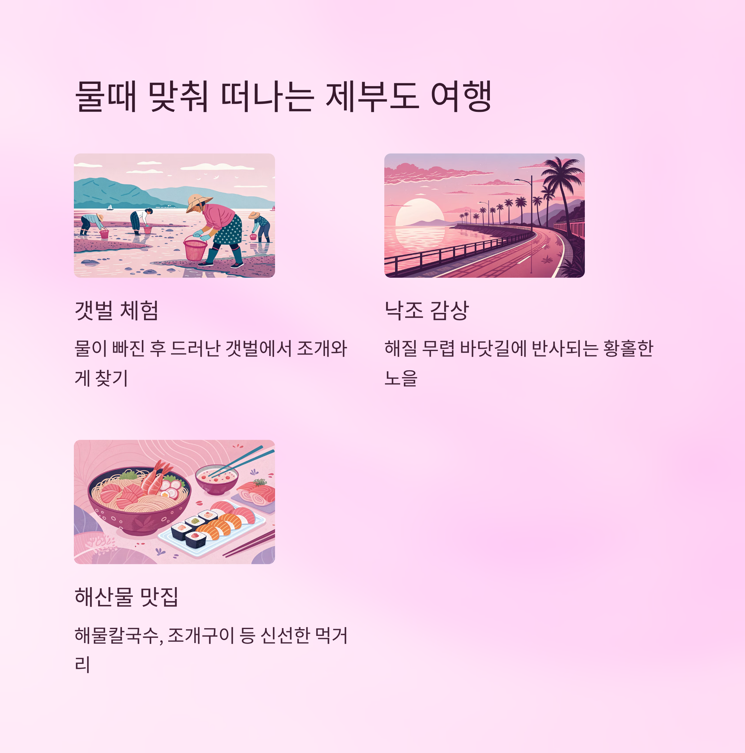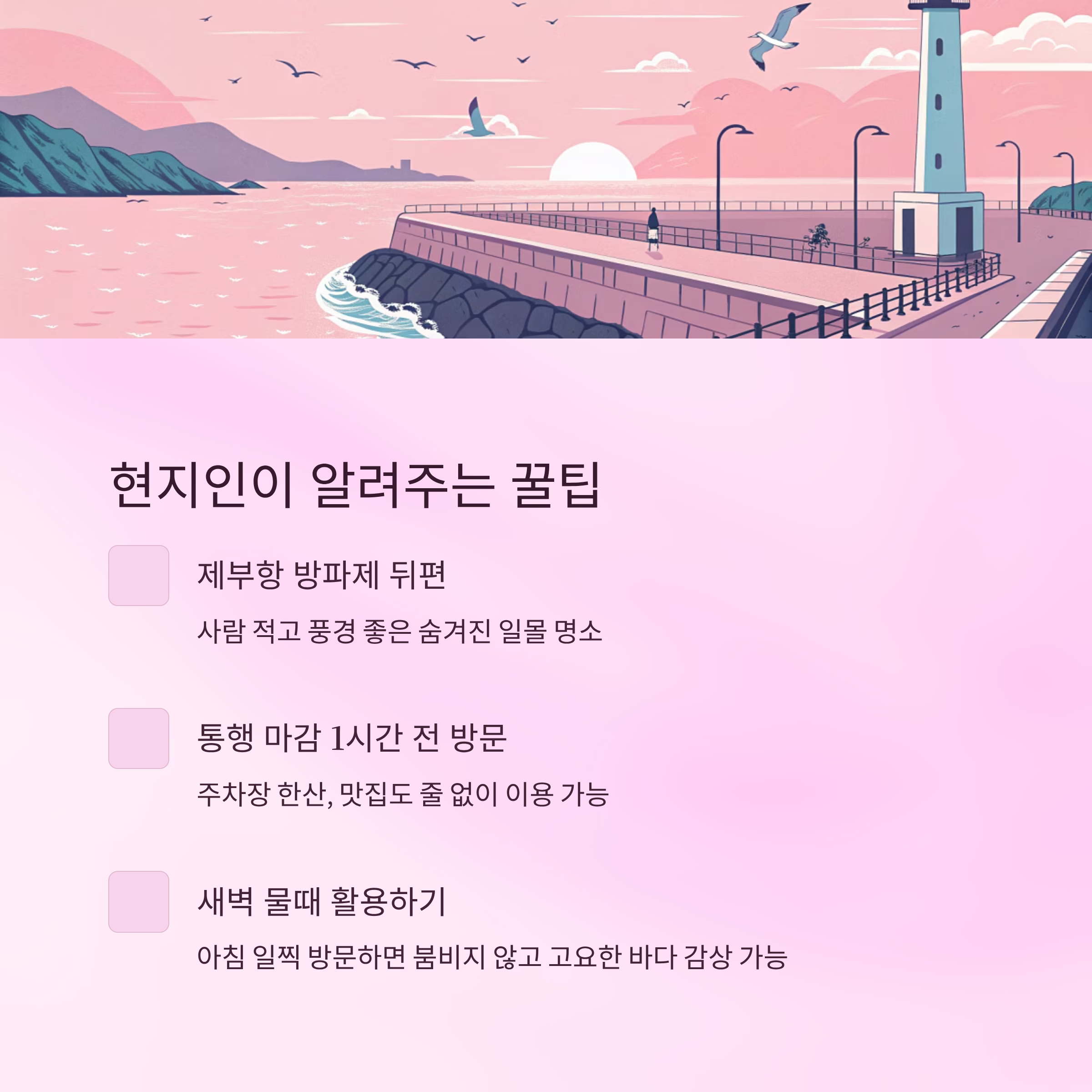 물때에 맞춰 이렇게 짜인 여행 계획은 스트레스를 줄이고, 훨씬 여유로운 여행이 되도록 도와줘요. 여행의 묘미는 바로 '타이밍'이니까요! 😉