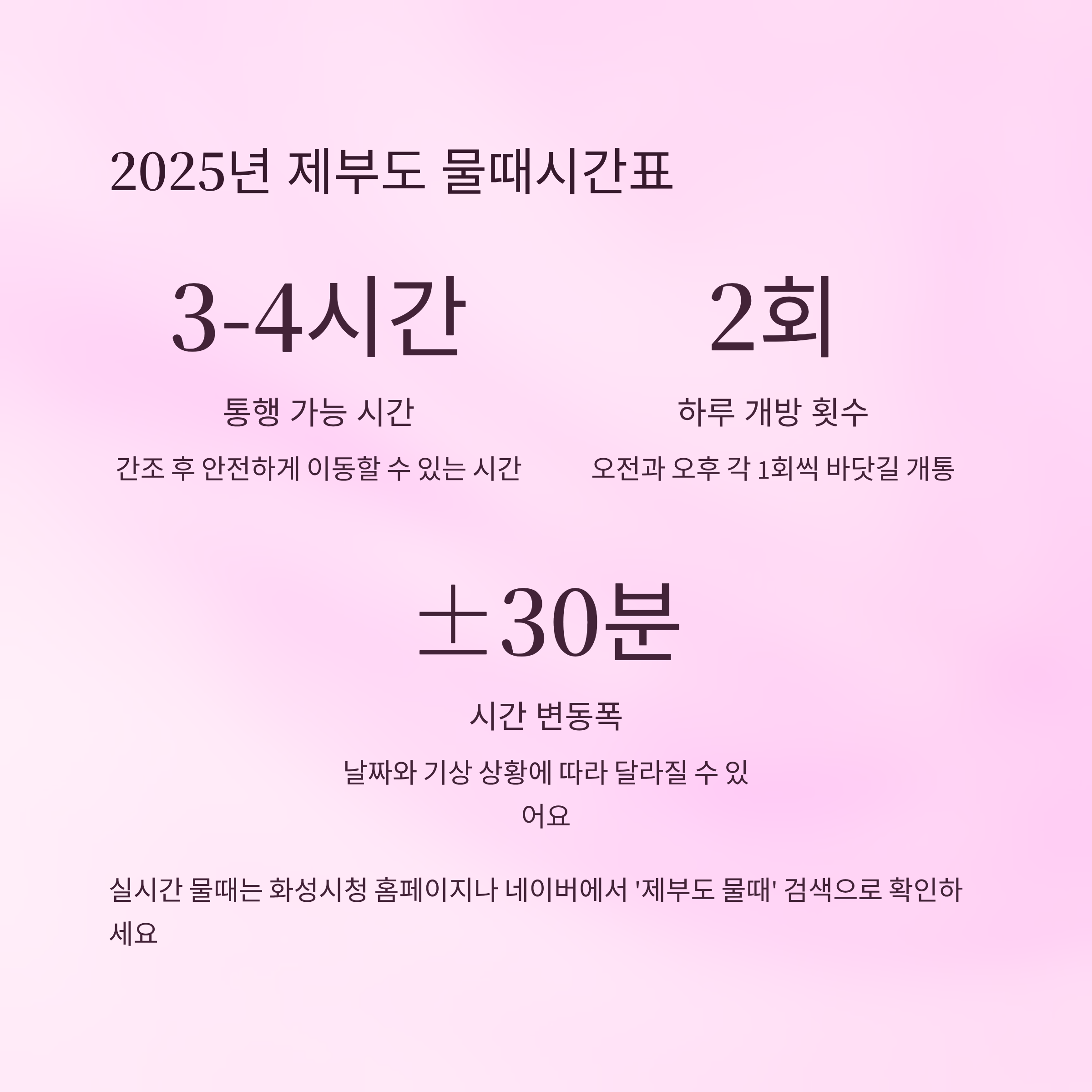 ※ 본 정보는 2025년 기준 제부도 물때 기준으로 작성된 참고용 가이드이며, 실제 상황에 따라 변동될 수 있어요. 여행 전 실시간 정보를 꼭 확인해 주세요.