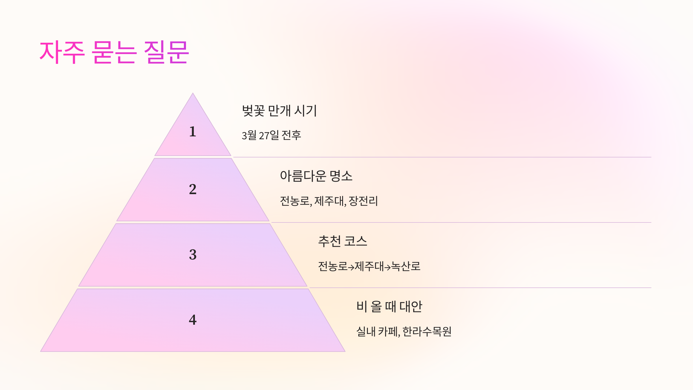 A5. 벚꽃을 제대로 즐기려면 다음 코스를 추천해요! 🚗 1일 코스: 전농로 벚꽃길 → 제주대학교 → 녹산로 드라이브 🚗 2일 코스: 장전리 벚꽃길 → 예래생태공원 → 제주 왕벚꽃 축제