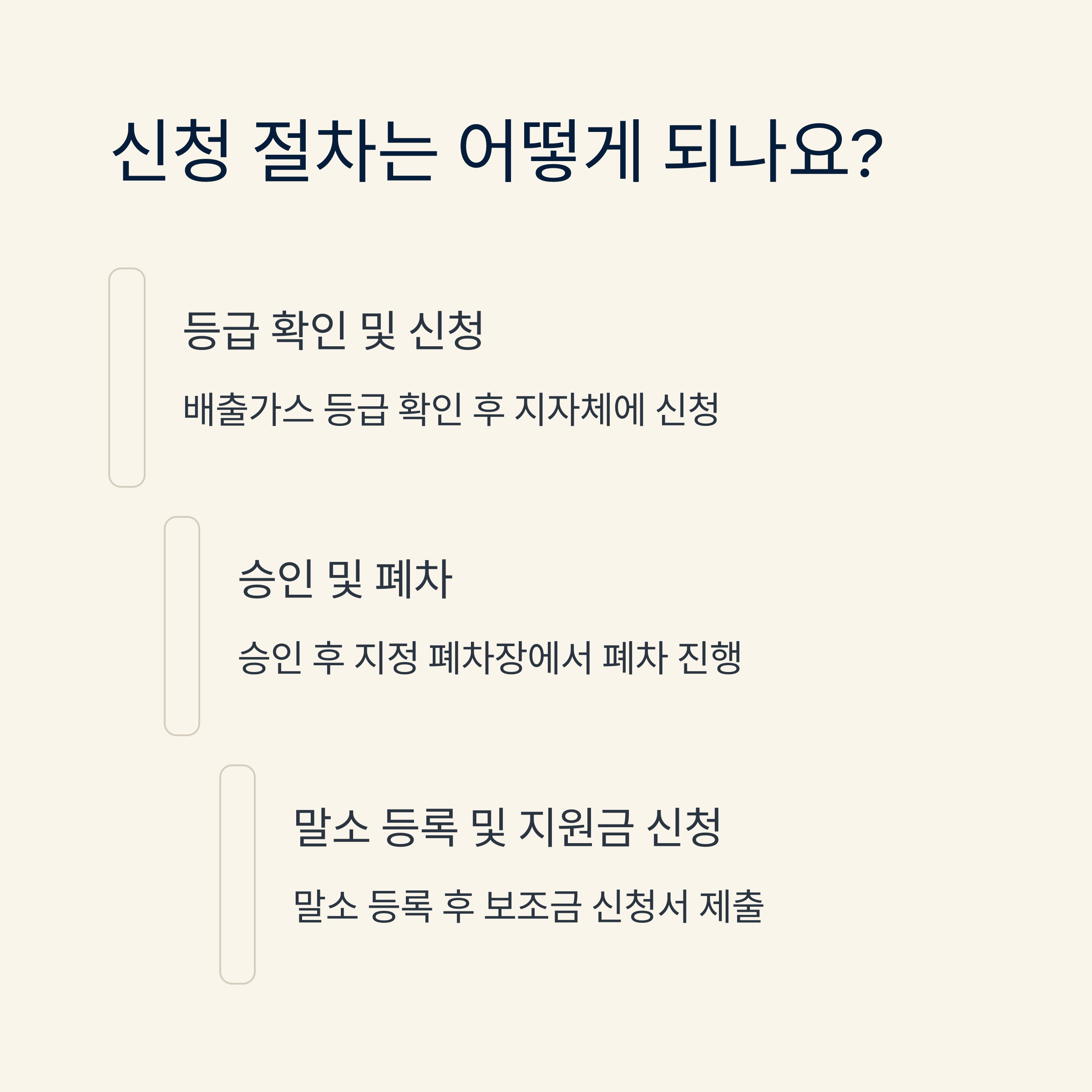 절차는 다음과 같이 진행돼요. 먼저 배출가스 등급 확인 → 신청서 접수 → 차량 상태 및 소유자 확인 → 조기폐차 결정 통보 → 폐차 진행 → 지원금 신청 및 입금 순으로 이루어져요. 서류에는 자동차등록증, 신분증, 통장 사본 등이 필요해요.