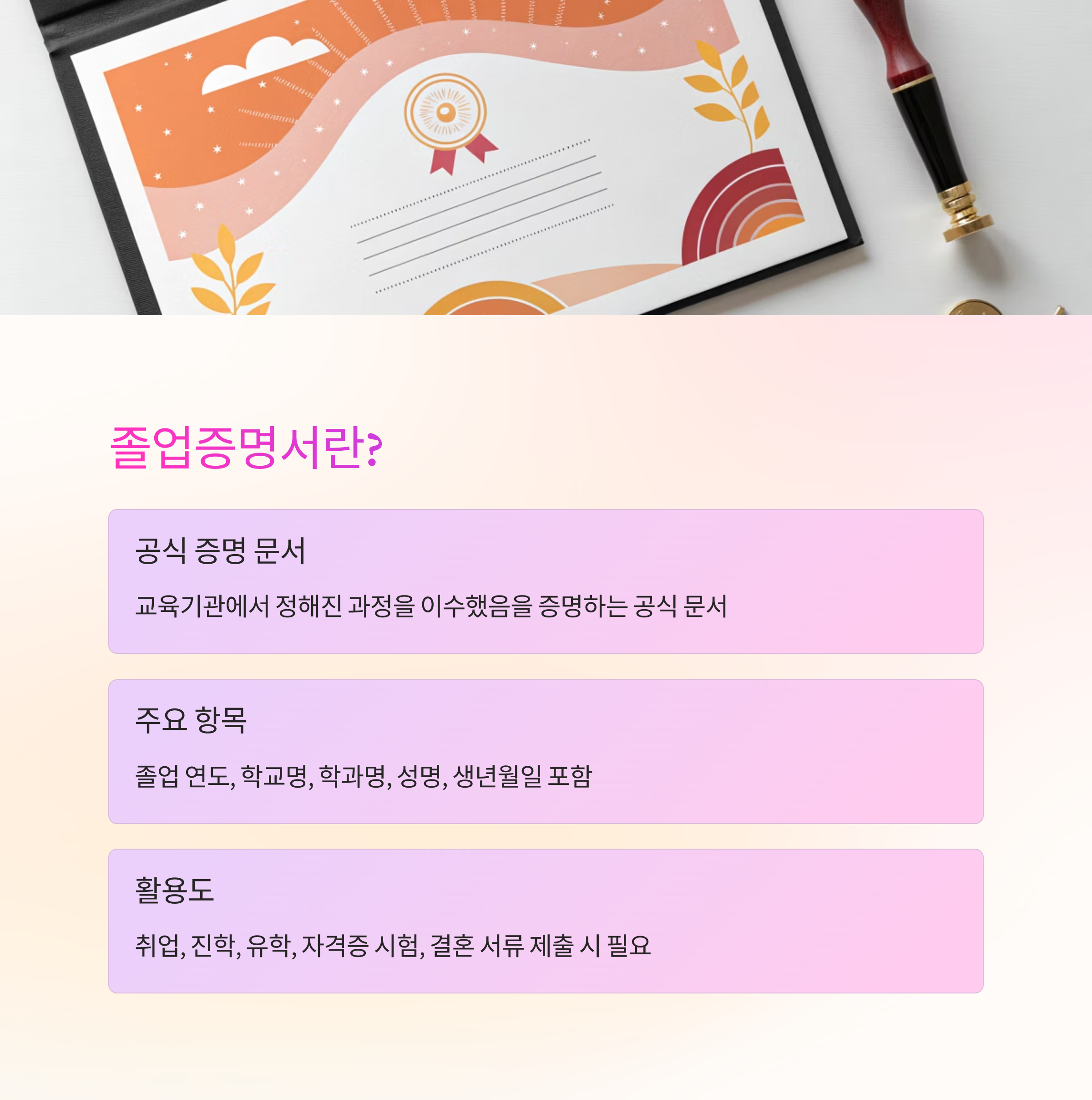 종이 서류 외에도 전자 졸업증명서도 활용되고 있어요. 전자서명된 증명서는 위조나 변조가 어렵기 때문에 공신력이 매우 높죠. 이처럼 졸업증명서는 사회생활을 시작하며 꼭 필요한 서류 중 하나랍니다!